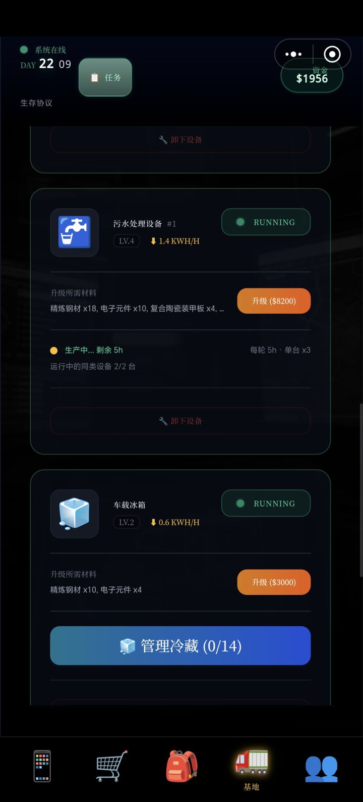 新版后,进入废墟收刮物资,爬层要一次100层太累太耗休息时间了!!这才第一旧街,简易,背包才只能装64格物品,除了所有食材能一次性任务内无限迭加,武器,装备,只要装满64格后,既无法再取,第五军设施那,地狱,背包爬第6层就装满了!,因该设置每次坎,每次下去搜索,爬过5~10~15等可以选择从何层开始,而不是都从第一蹭搜起,,玩下墓游戏也是不可能一次性搞完所有层的搜索,,而搜索的目的是为了物资与通关,,一次性需要爬100层,,怎搞,不吃不喝不睡啊!!