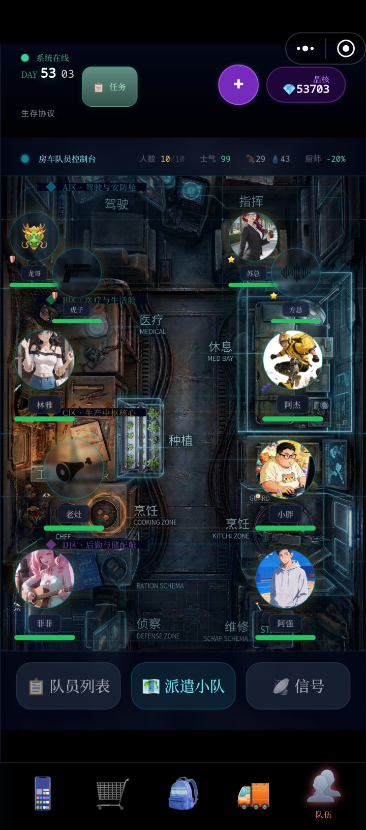 在论坛翻了一下没有队友集齐需要怎么回复的攻略,只能自己摸索了。试了几局,选择各种对话,终于把七名队友凑一起了,阿强在第43天(末日第36天)的时候上车,不过前提好像需要给流浪老大爷吃饭,这个NPC忘记在第几天出现了。发出来希望能帮到还在摸索探路的朋友。又增加了阿敏对话,试了几个档阿敏总是到48天的时候发来语音留言,说她噶了,真无语,现在把对话发出来自己也留个备注,以防下次又发错