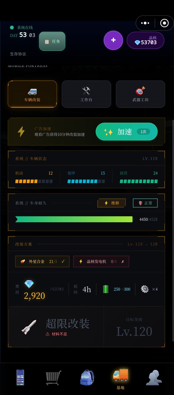 BUG:物品堆叠有BUG。今天把物品整理了一下,有一些物品可以超出上限。自己摆放就不会。更新感受:刷图获取晶核收益变高了很多,也不会出现刷图资源过多带不回来的情况。但是房车升级消耗巨大,升120级房车材料需要840000晶核,开加速升级一下就不够了。目前战斗难度还是很轻松的,一回合基本都是秒,霰弹、匕首、步枪、手枪全都试过了,区别不是很大,霰弹暴击伤害高,匕首流血伤害很高,步枪破甲破盾很全面,手