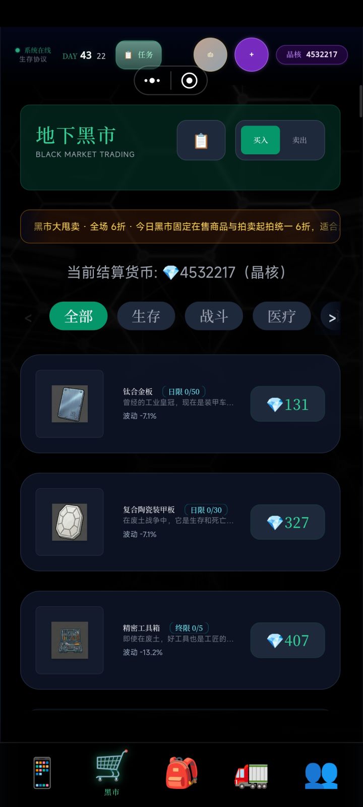 今日黑市六折,四百多万晶核兄弟们建议买点啥,才生存44天,后面啥是刚需