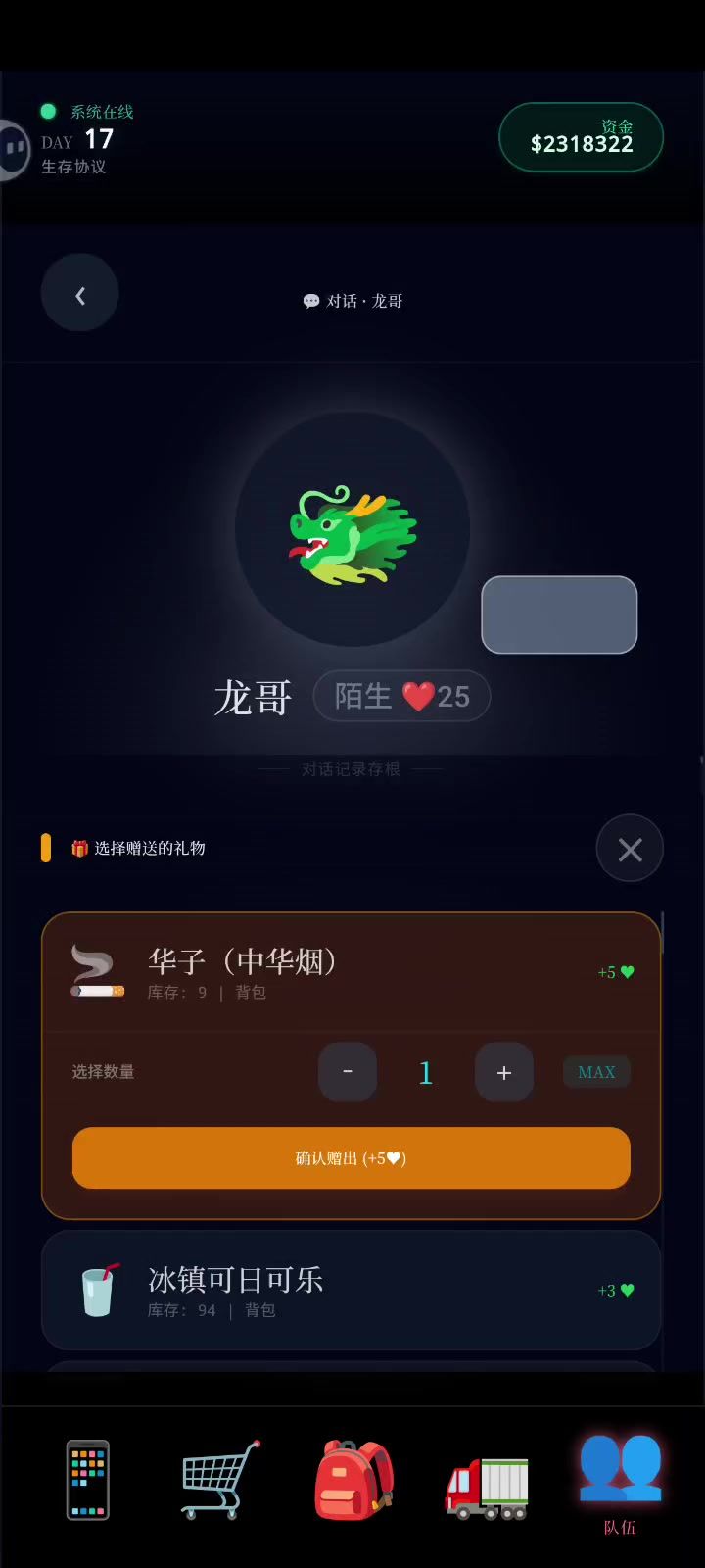 🎮 游戏信息:《末世:我有一辆房车》 这是一款文字模拟经营类末世生存手游,核心玩法是“重生囤货+房车改造”,主打安逸爽感的末日生存体验。 📊 画面信息解读 - 核心状态面板: - 生存属性:饥饿120、口渴120、心情100、燃油180 - 环境温度:车内恒温26℃,车外极寒-14℃(体现房车改装后的舒适生存优势) - 倒计时:56分33秒(可能是事件倒计时或探索计时) - 社