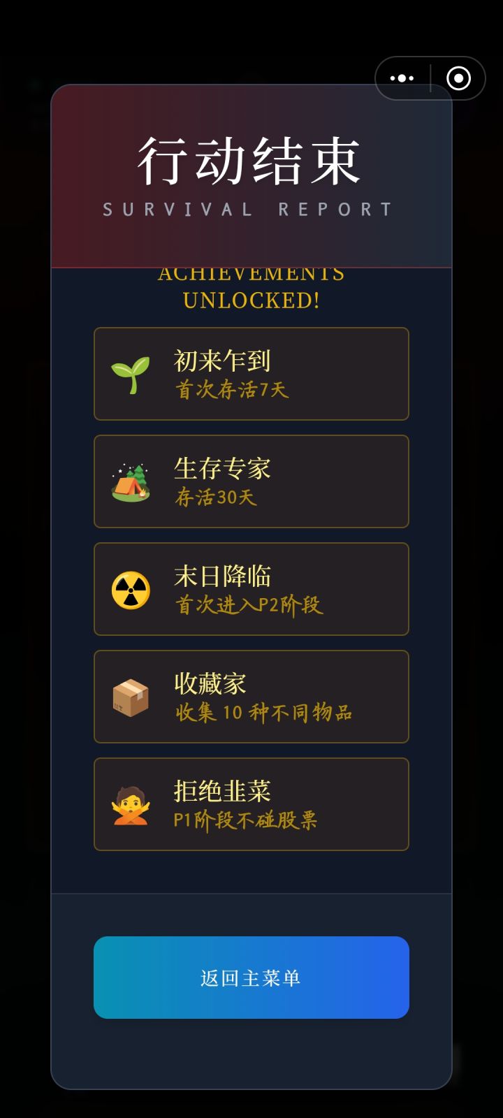 囤囤鼠一个,包里一堆方便面火腿肠,很简单的一个游戏,但是实在太无聊了…每天就是吃饭喝水睡觉吃饭喝水睡觉,把探索全通关了就没事干了,汽油不够了才去捞点。指尖陀螺(啥啊)对我来说的唯一作用是嘲讽邻居大妈…孩子们还是卖了吧没啥用啊,太难死了。车三级就够了,包二十格绰绰有余。最后去的避难所,不是坑,我还一直怀疑是坑把人骗进来杀()建议加个员工管理,微信剧情说某某(防剧透)帮忙算账了但是我本人不知情