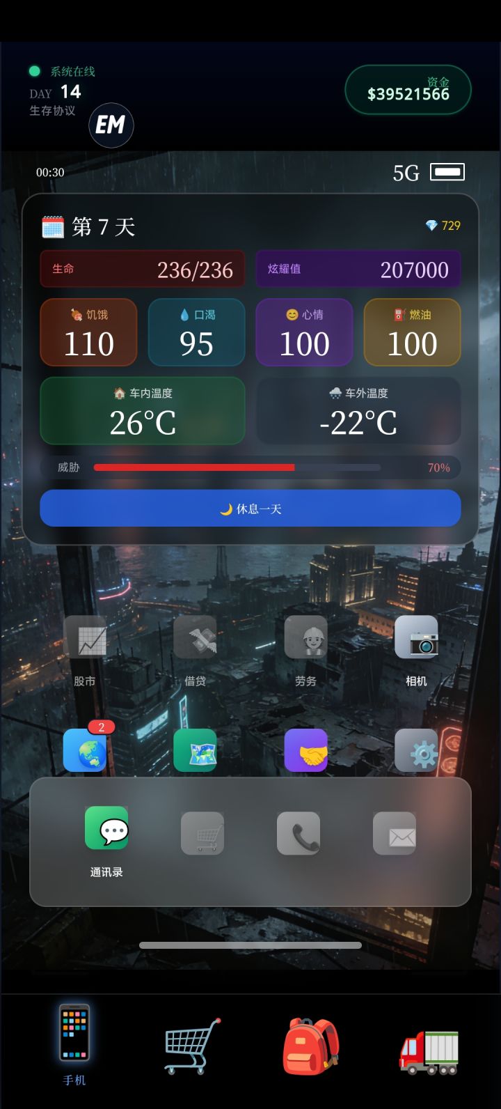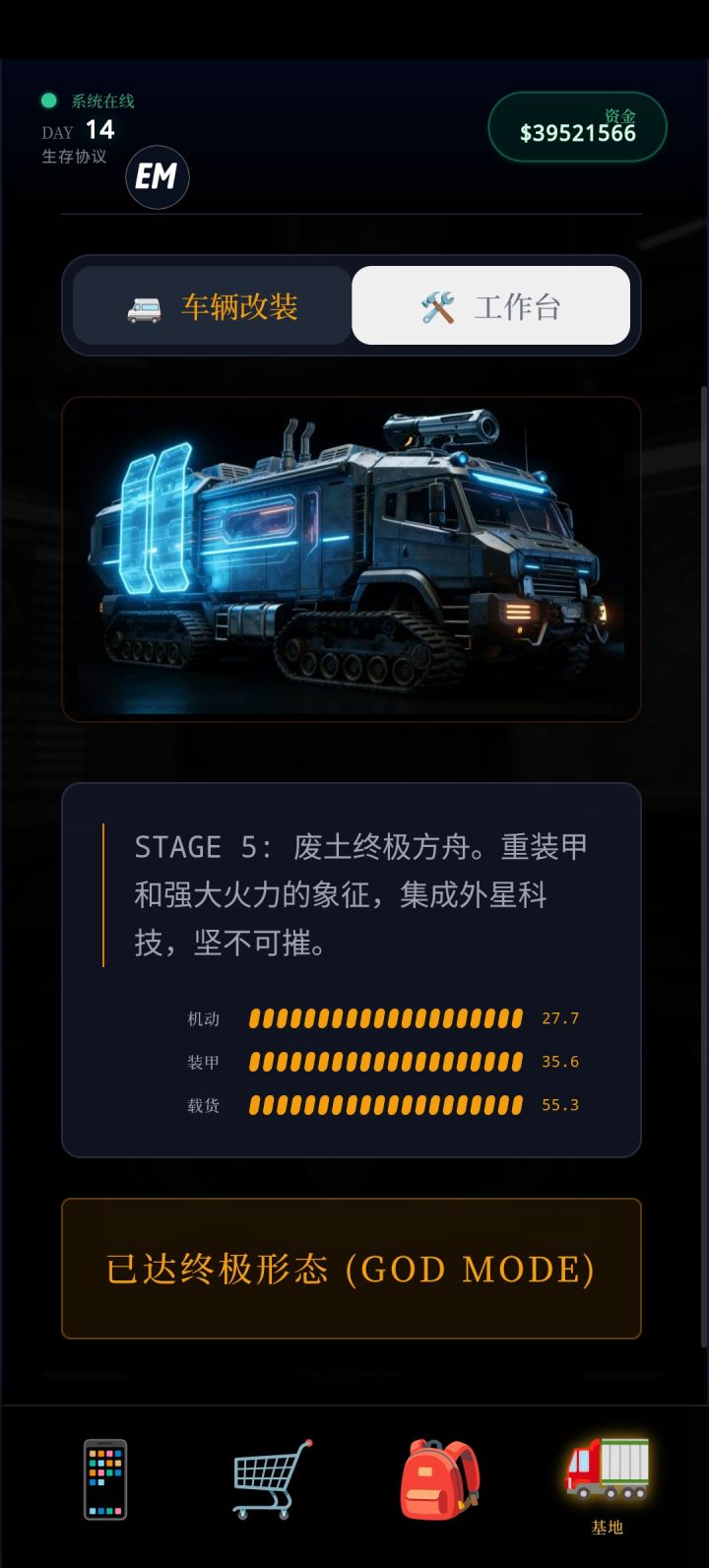 说几个小技巧,前七天每天把冰镇可乐买完,一天五十瓶而且很便宜,但是七天后卖的很贵。优先把水生产线弄出来,后面完全可以卖水为生,第十五天货币崩溃,钱记得能用全用了,我特么全砸手上了,车辆升级到第五级了后面不知道还有没有新等级,钻石太贵了。还有这个什么反应堆到底装哪里的?工作台装不了这玩意,看说明说什么无限电源但是不知道咋装#
