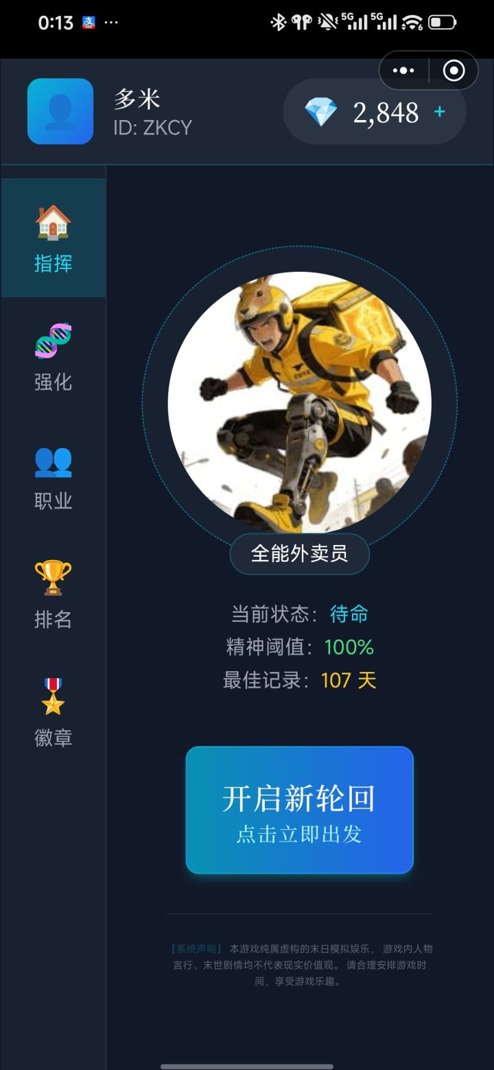 第二个轮回吧,看了下攻略,买了医疗股,后面直接买买买,后期沙拉吃到饱。 这里主要说一下台词文本,其实一开始都是常规末日流的那种,爽文选项。但是在20天后真的很无聊,当时去找龙哥聊天了,之前因为要坑你5000所以一直已读不回,结果发现龙哥还真的是个爷们,有事他是真上,还送了一把猎枪给我 至此换了一种玩的方式,对前任也没这么尖锐,对苏姐也没这么冷嘲热讽。。。心态不一样后,游戏的感觉也