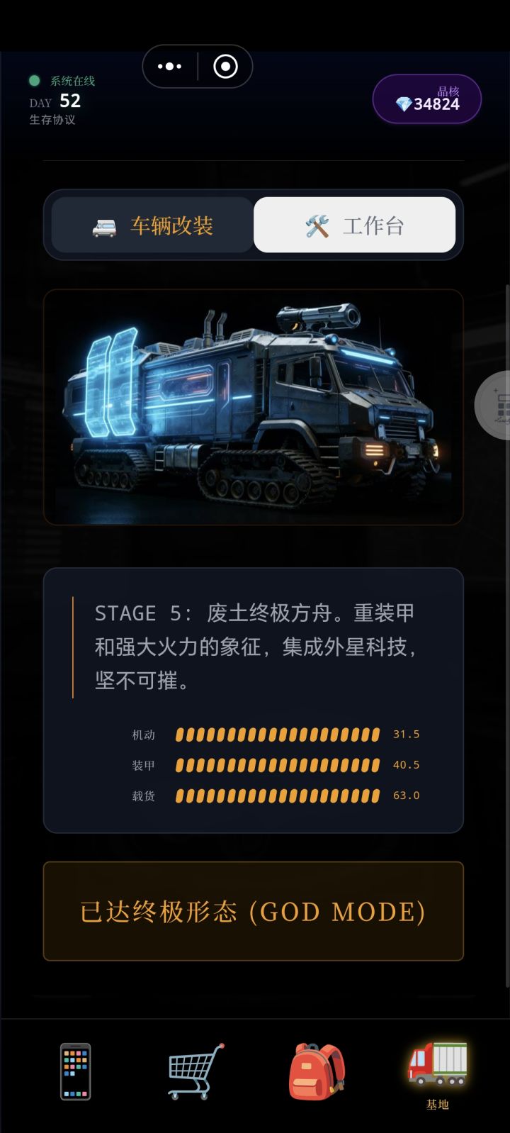 开局就去股票那刷钱最后两天就点一次买或者卖再退出重复到末日开始就可以有1000晶多刷个几次就可以满载具入局。然后你就无敌了资源根本不缺。