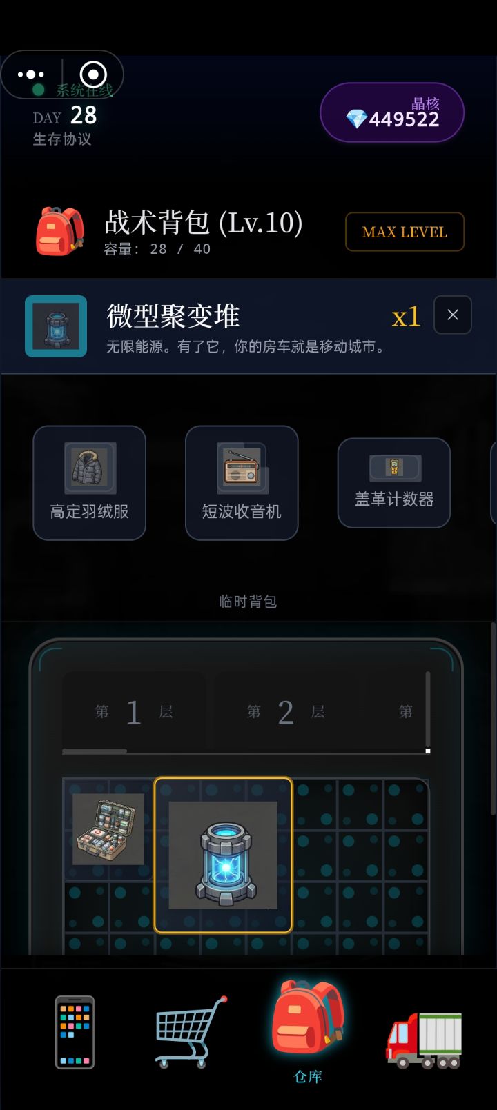 各位游戏共创、幸存者们:C哥说到做到,主打一个听劝整改,把大家吐槽的、想要的都安排上👇这次主要解决最近玩家们反馈的痛点问题:增加设备“冰箱”:食物腐败速度进冰箱后会降低#P2 增加“行动小时累计→满24自动推进”机制,把公路/废墟/升级接入耗时;修复“韭菜之王“角色的解锁链路(当卖出股票产生净亏损且血亏时,会正确触发天台事件);事件弹窗增强滚动并加右上角关闭按钮强化商店增加单局保命1