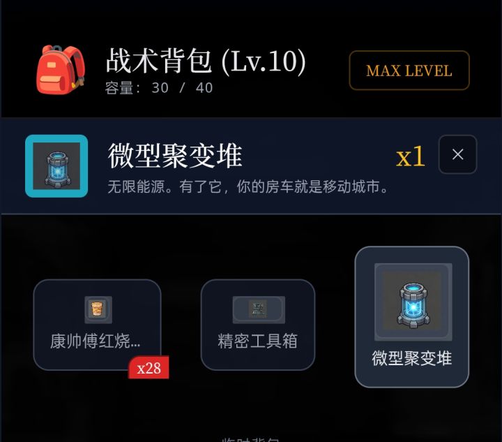 说几个小技巧,前七天每天把冰镇可乐买完,一天五十瓶而且很便宜,但是七天后卖的很贵。优先把水生产线弄出来,后面完全可以卖水为生,第十五天货币崩溃,钱记得能用全用了,我特么全砸手上了,车辆升级到第五级了后面不知道还有没有新等级,钻石太贵了。还有这个什么反应堆到底装哪里的?工作台装不了这玩意,看说明说什么无限电源但是不知道咋装#