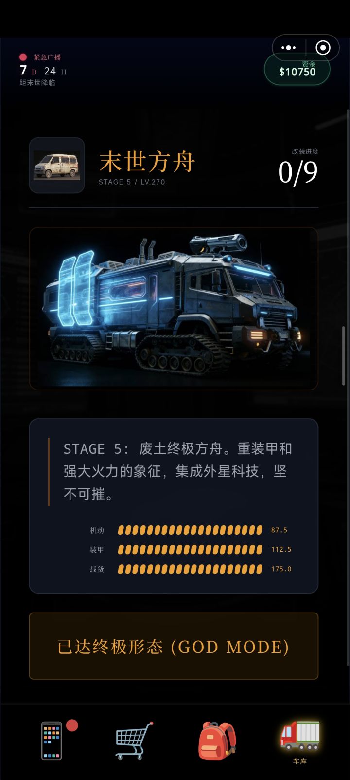 说几个小技巧,前七天每天把冰镇可乐买完,一天五十瓶而且很便宜,但是七天后卖的很贵。优先把水生产线弄出来,后面完全可以卖水为生,第十五天货币崩溃,钱记得能用全用了,我特么全砸手上了,车辆升级到第五级了后面不知道还有没有新等级,钻石太贵了。还有这个什么反应堆到底装哪里的?工作台装不了这玩意,看说明说什么无限电源但是不知道咋装#