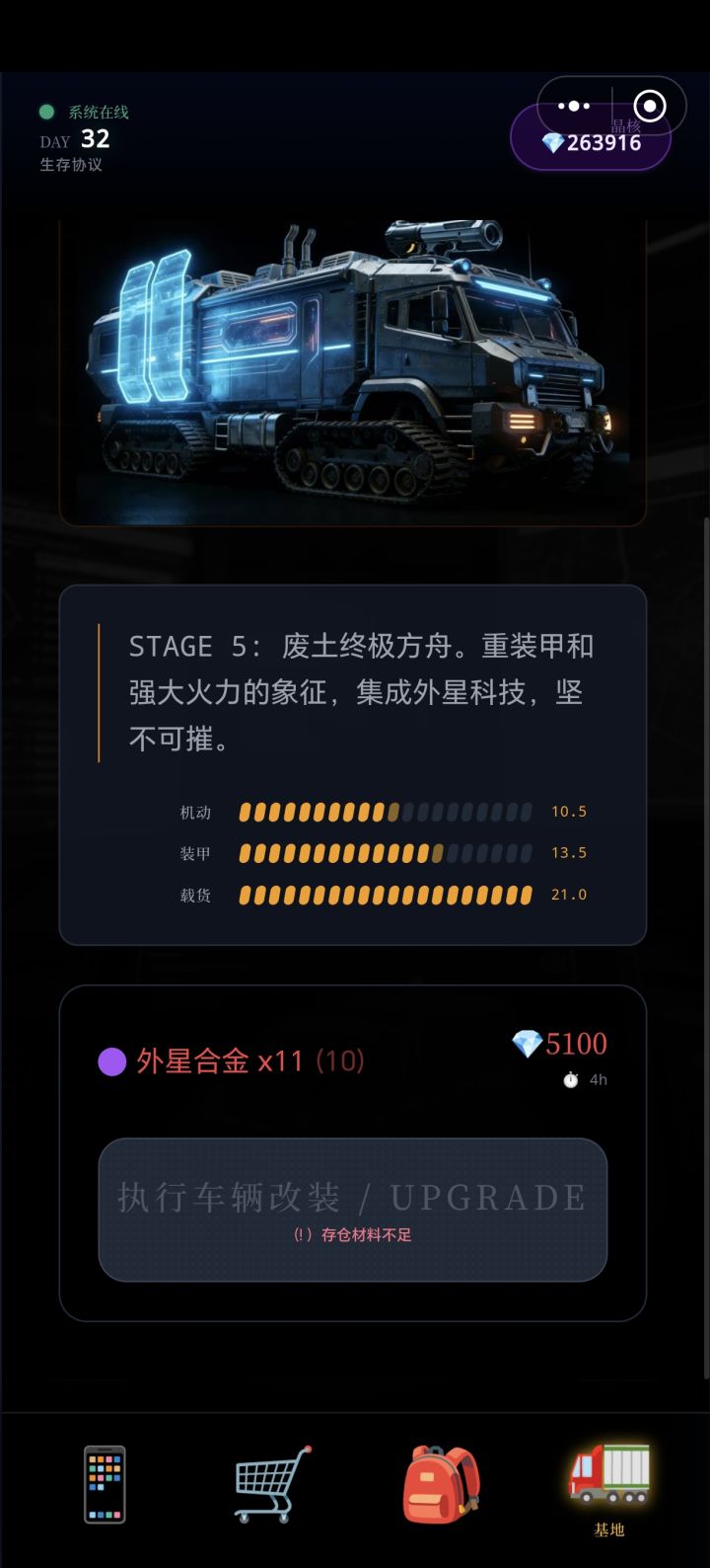 《末世:我有一辆房车》的幸存者们:大家好,我是 C 哥。先说句对不起:昨天说好的云存档 + 排行榜,因为合规审核问题没上线,让大家白等了,真的抱歉。为了弥补这次失误,新版本更新如下内容:🎬 剧情更新:你的每一个选择,都在改写世界我们收到了大量关于剧情单薄、NPC 缺乏后续的反馈,这次更新对末世后的剧情进行了全面扩容:大幅度提升末世中后期剧情密度你的选项会影响 NPC 结局多结