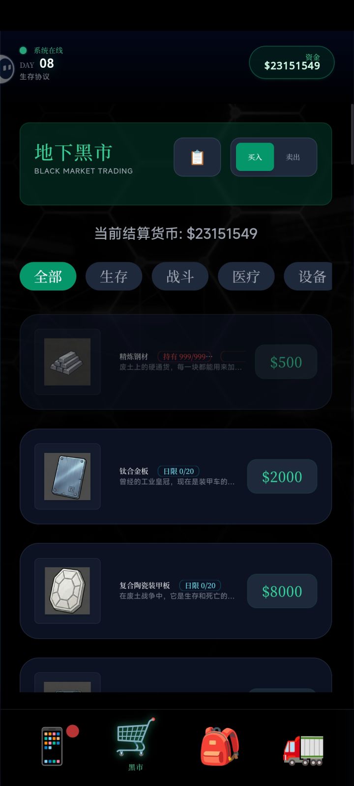 各位游戏共创、幸存者们:C哥说到做到,主打一个听劝整改,把大家吐槽的、想要的都安排上👇这次主要解决最近玩家们反馈的痛点问题:增加设备“冰箱”:食物腐败速度进冰箱后会降低#P2 增加“行动小时累计→满24自动推进”机制,把公路/废墟/升级接入耗时;修复“韭菜之王“角色的解锁链路(当卖出股票产生净亏损且血亏时,会正确触发天台事件);事件弹窗增强滚动并加右上角关闭按钮强化商店增加单局保命1