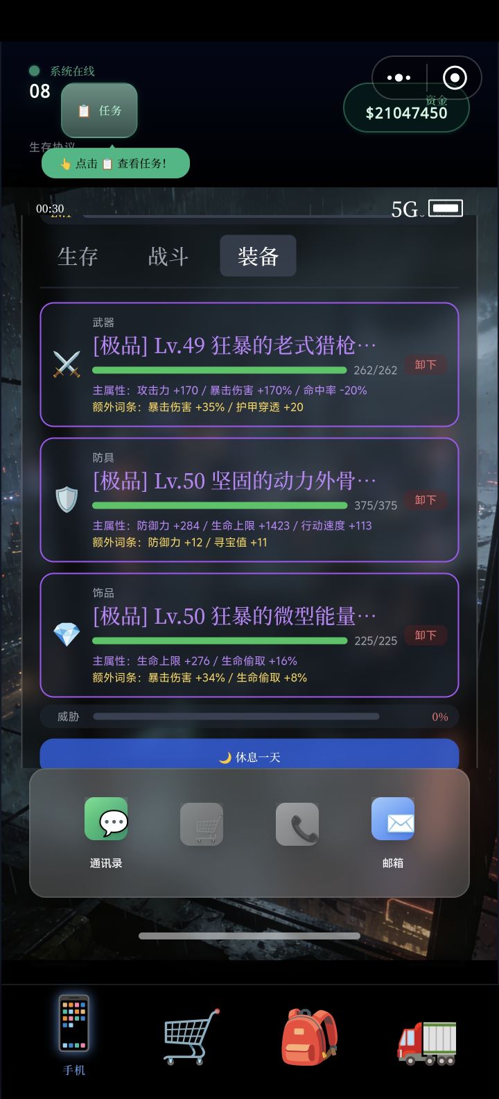 各位共创玩家、幸存者们:C哥还是老样子,玩家提的需求、吐槽的痛点,能改的全改,能加的全加。这次2.1.0版本,主打一个永久养成、容错拉满,废话不多说,更新内容直接摆台面👇🔥 2.1 版本核心更新内容1. 剧情继承解决大家吐槽最多的重复开荒问题,P2阶段意外死亡开新轮回后,下一把直接跳过P1末世前7天微信聊天剧情,不用再从头熬剧情,效率拉满!2. P2任务引导系统(新手老手都不迷路)新