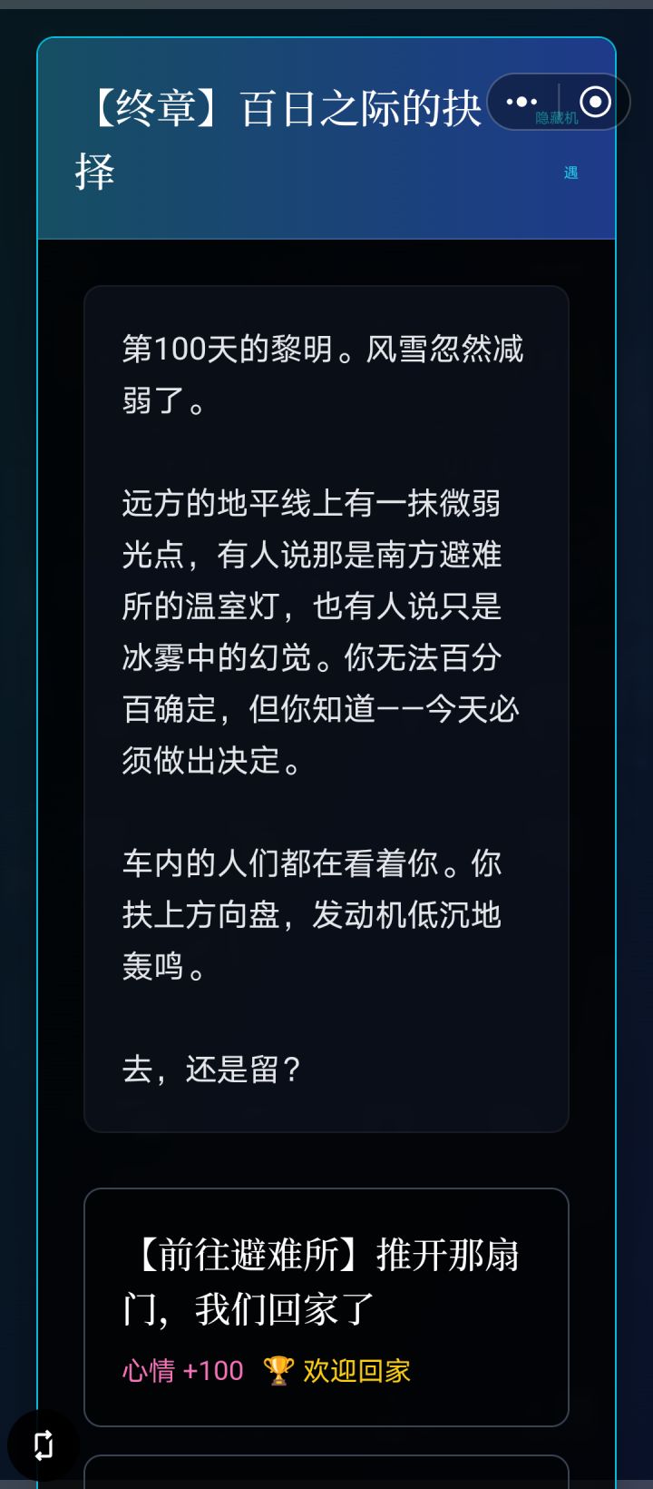 《末世:我有一辆房车》的幸存者们:大家好,我是 C 哥。先说句对不起:昨天说好的云存档 + 排行榜,因为合规审核问题没上线,让大家白等了,真的抱歉。为了弥补这次失误,新版本更新如下内容:🎬 剧情更新:你的每一个选择,都在改写世界我们收到了大量关于剧情单薄、NPC 缺乏后续的反馈,这次更新对末世后的剧情进行了全面扩容:大幅度提升末世中后期剧情密度你的选项会影响 NPC 结局多结