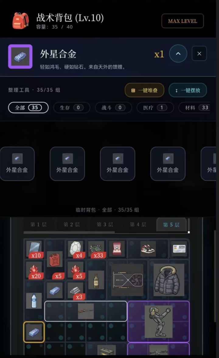 新版后,进入废墟收刮物资,爬层要一次100层太累太耗休息时间了!!这才第一旧街,简易,背包才只能装64格物品,除了所有食材能一次性任务内无限迭加,武器,装备,只要装满64格后,既无法再取,第五军设施那,地狱,背包爬第6层就装满了!,因该设置每次坎,每次下去搜索,爬过5~10~15等可以选择从何层开始,而不是都从第一蹭搜起,,玩下墓游戏也是不可能一次性搞完所有层的搜索,,而搜索的目的是为了物资与通关,,一次性需要爬100层,,怎搞,不吃不喝不睡啊!!