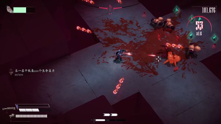 另外一个攻击方式就是角色背上背的武器,使用近战攻击,会进行一段小范围的近战攻击,近战攻击对带甲壳的怪物有起效,往往一次近战攻击就能把甲壳打掉,同时近战可以给鼠标右键的重武器充能,鼠标右键是一个中等范围扇形的射击,射击有次数,无法自动上弹,只能通过近战攻击充能,增加右键重武器的攻击次数。剩下的就是一个空格的闪避了,闪避可以触发精闪,会有短暂的一个子弹时间。