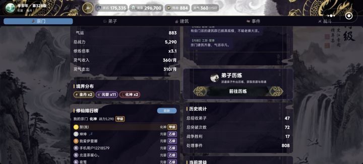 希望可以完善一下ai宗门还有随机事件出现秘境这些 目前感觉ai宗门太憨了 如果可以把ai宗门和我们宗门的实力差距标识出来就更好了 比如我们比他强 就标记该宗门为卑如蝼蚁 如果差不多 就标为不分秋色 如果他们比我强 就标为望尘莫及 这个情况希望可以把每个宗门起跑线开局都设定为一样 根据前期的运气和获得的资源或者宗门掠夺打杀造成弟子陨落来慢慢拉开差距 然后如果可以的话 可以来一个外交 外交决定了弱的也