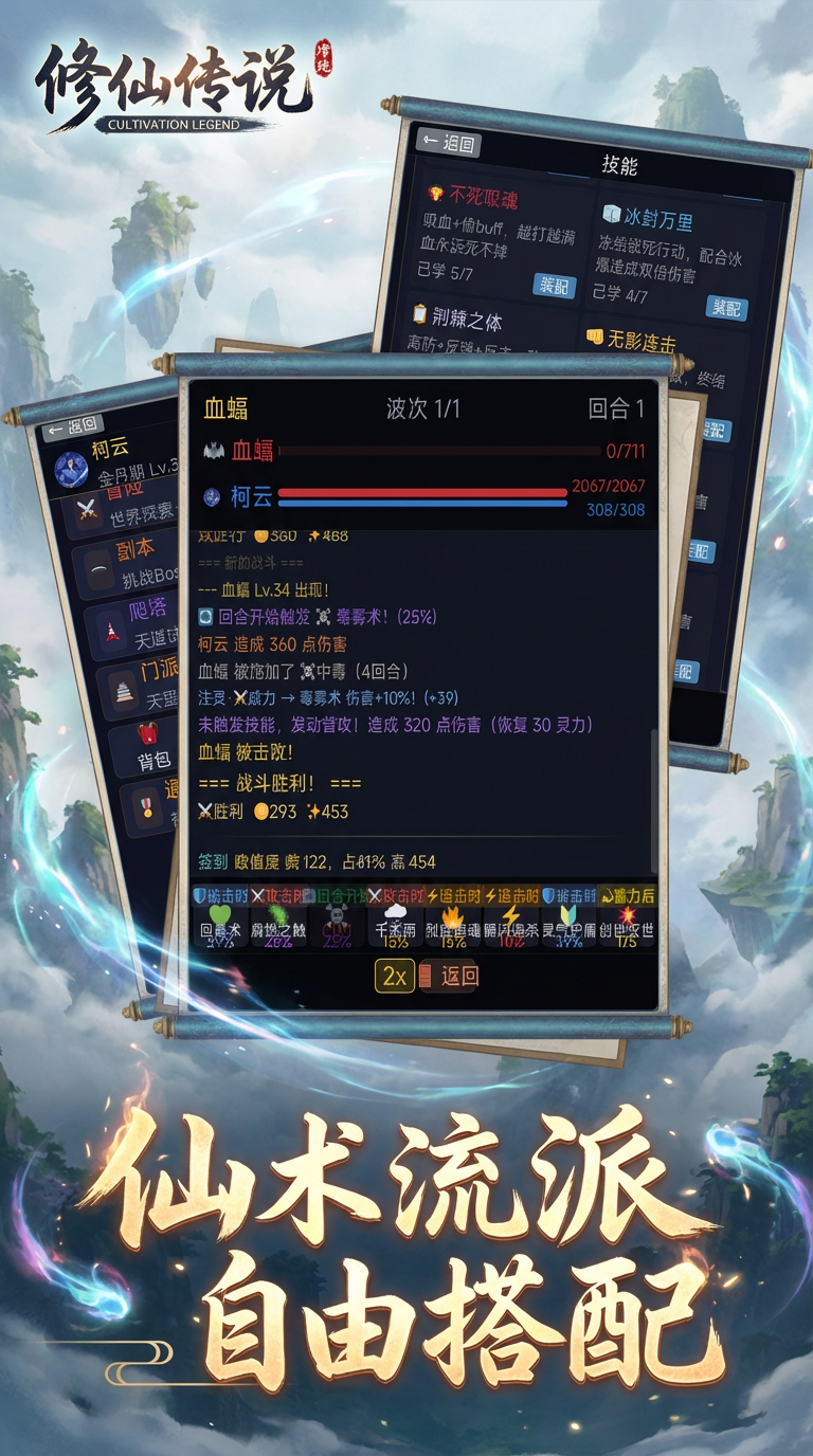踏入修仙世界,从炼气期一路修炼至渡劫飞升。习得数十种仙术神通,探索秘境副本,挑战天道试炼塔,在擂台上与其他修仙者一较高下。多流派自由搭配,打造属于你的修仙之路。