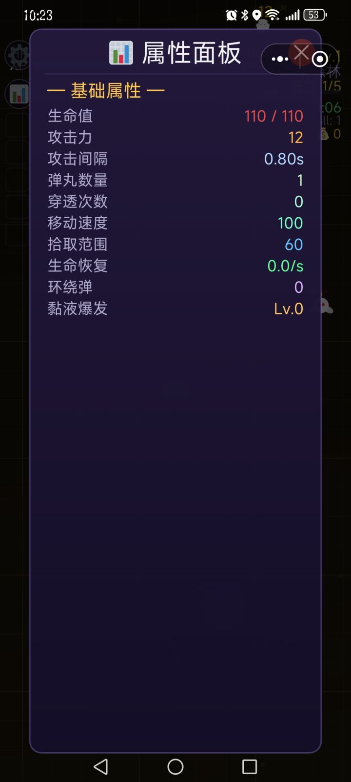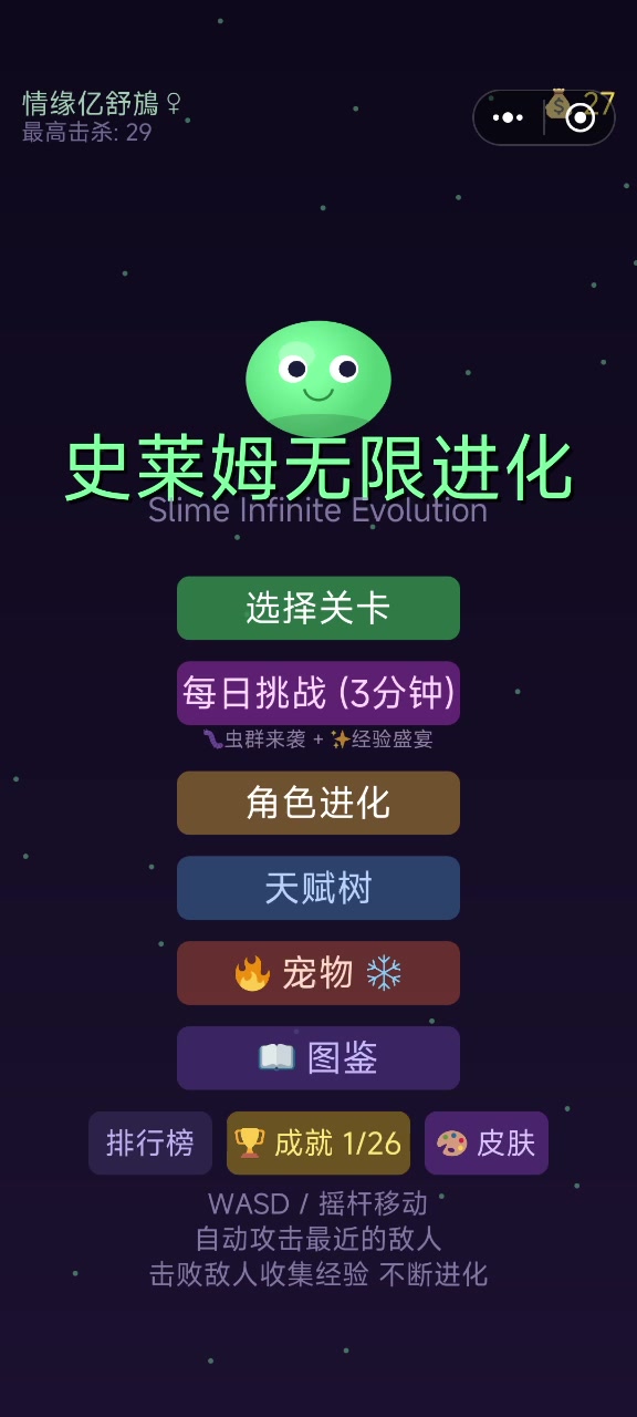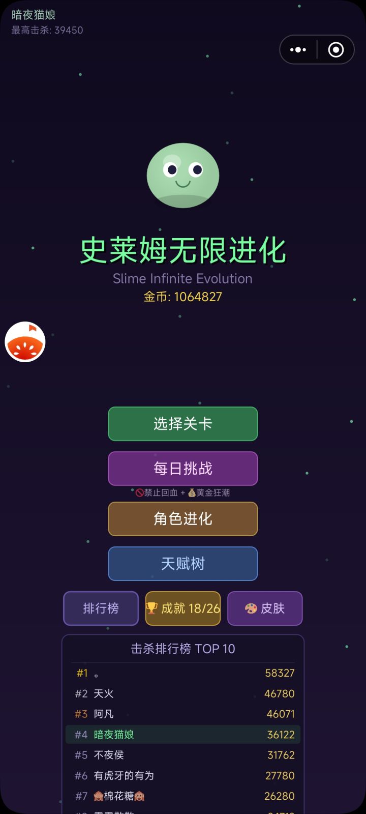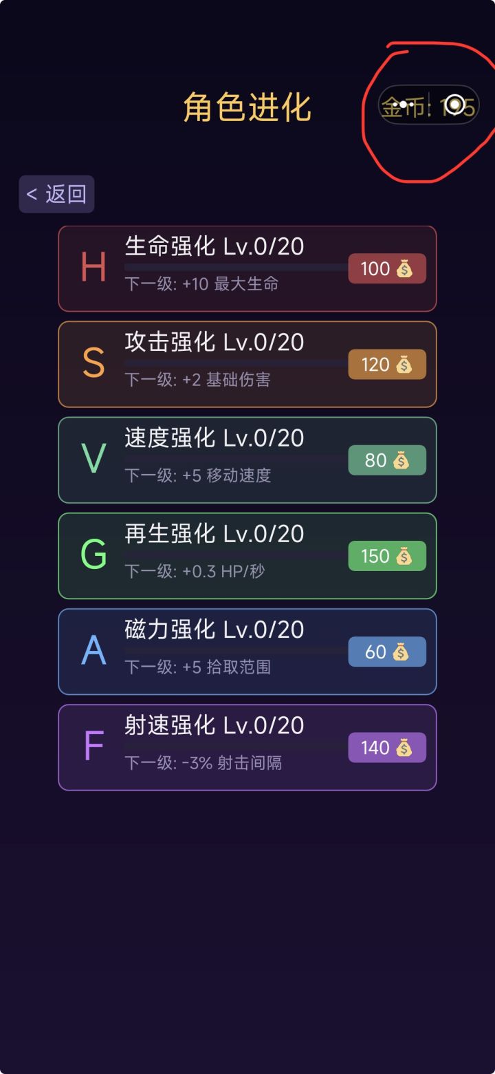 进化页面,小程序返回按钮把金币挡了个结实,然后就是打完怪之后,那个经验值就存在几秒,我拉扯了一堆怪,还没拐回去吃经验,经验就消失了,不能改成永久存在的吗,或者改成范围触发消失的,把范围搞大一点呢?稍微一拉扯就吃不到经验,而且你这关卡难度跨度还那么大,第一波几个小怪,第二波来几十一百只,我打一个需要五秒,我得打多久才能打死完,你至少等我等级高了再放大波怪吧