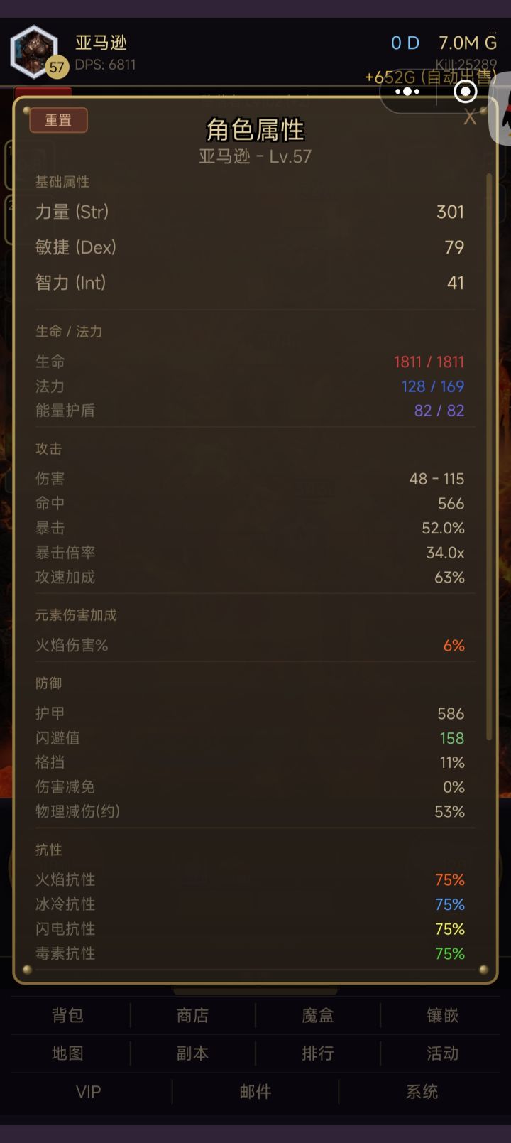 其次,这个游戏很好地还原了暗黑系列的精髓——装备系统。这套系统有独立的原则,比如,颜色代表词条数量、装备等级代表词条的类别和数值等等。因此,装备的搭配并非一成不变,一件词条搭配合理的高级黄装,可能比绝大多数的暗金更好,比如我下面配的图。像这样讲求搭配,而非无脑刷暗金等高级颜色装备的游戏,在今日的手游里算是一股清流。