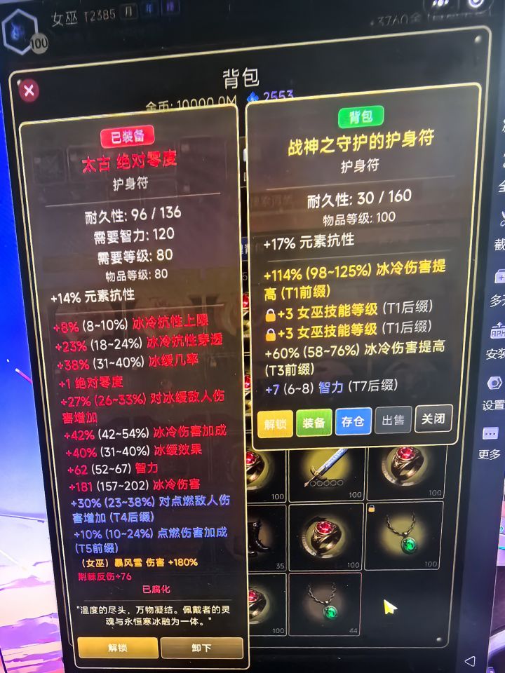 女巫项链实测不追求极限可以用绝对零度,木桩测试左边伤害比右边高