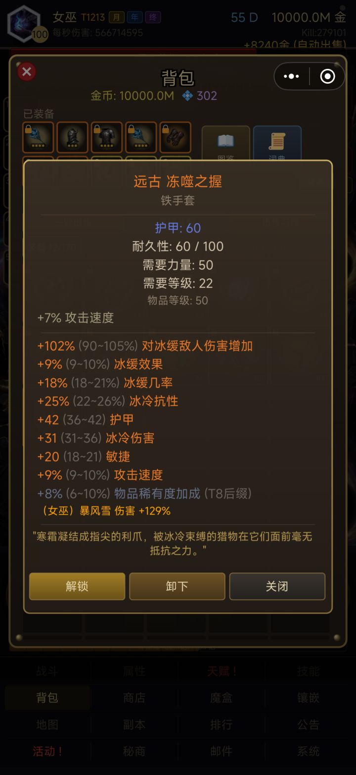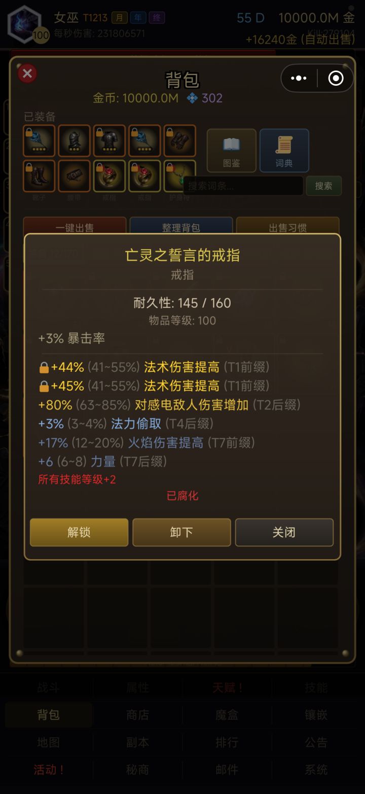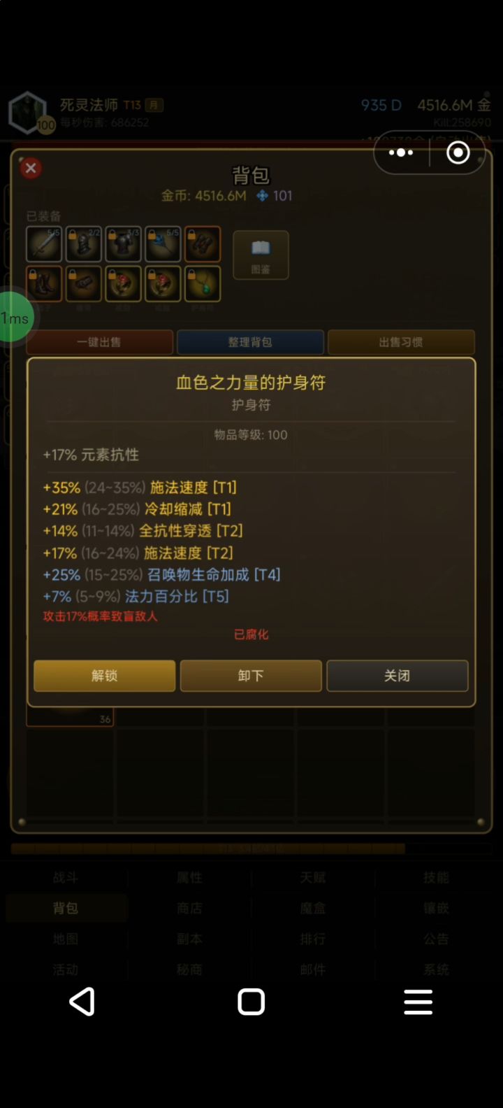 前期装备方面不需要看属性 魔盒一键腐化一件出售 只要+技能等级 死灵最重要的就是技能等级