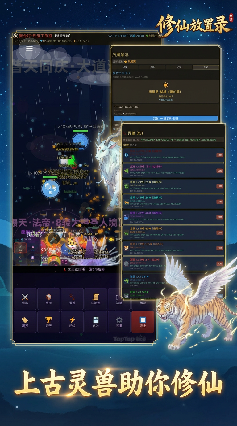 修仙放置RPG,收服青龙白虎麒麟等上古灵兽,突破百层星系生命层次,攀登永生试炼塔。法翼进化、灵兽养成、山海经探索,多系统联动打造你的修仙之路!