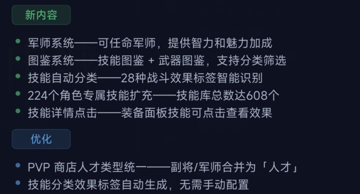 军师系统 — 新增军师槽位,可任命人才为军师,提供智力和魅力加成,与副将系统并行图鉴系统 — 新增技能图鉴和武器图鉴两大板块,可浏览全部技能/武器条目技能自动分类 — 28种战斗效果标签智能识别(闪避、反击、护盾、流血、恢复、灼烧、冰冻、毒素、眩晕、吸血、暴击、增伤、减伤、先手、嘲讽、削弱、斩杀、风障、统兵、范围、分身、反弹、荆棘、狂怒、连击、复活、封技、吸取)224个角色专属技能扩充 —