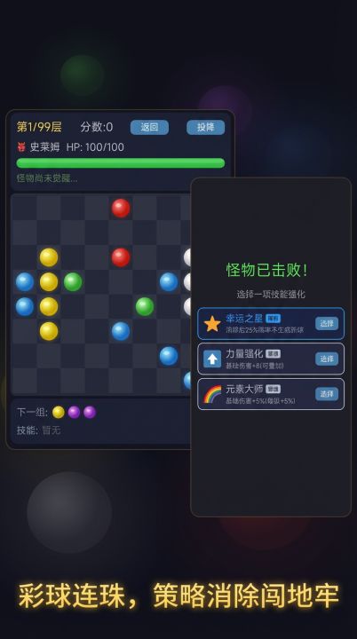 创作者的话连珠消除+Roguelike地牢,36种技能选择成长,挑战99层!