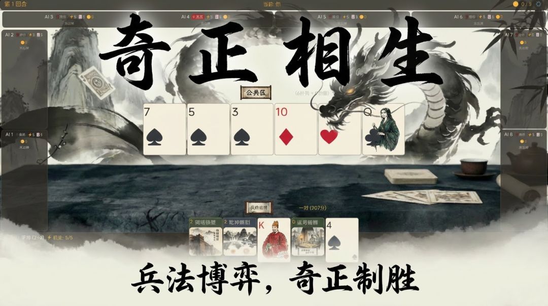 一款融合中国古典兵法智慧的策略卡牌游戏。以扑克牌为基础,加入功能牌与阵营机制,支持2-9人对局。基础模式比拼牌技与计谋,阵营模式中赤、黑、俊杰三方势力暗流涌动,尔虞我诈。奇正之间,胜负未定!