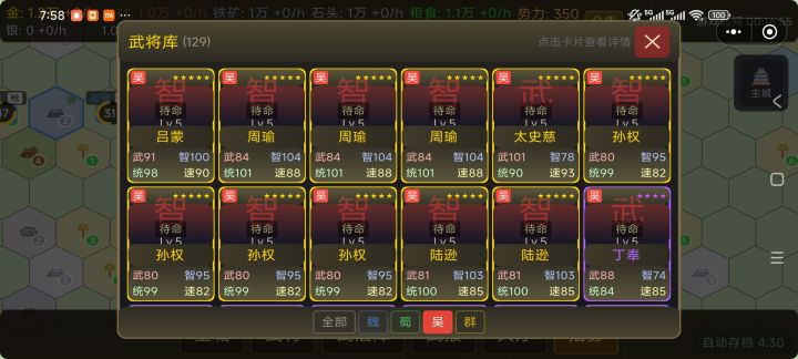 : 是刚刚开始就卡吗还是玩一会就才卡呀,战法对阵营加成确实比较大,我玩的时候也发现了,后续会优化,另外就是元宝的话就是那个黄金,在地图中间那里有,过了关隘就可以占领黄金资源地了,感谢好评,我会抓紧时间化~