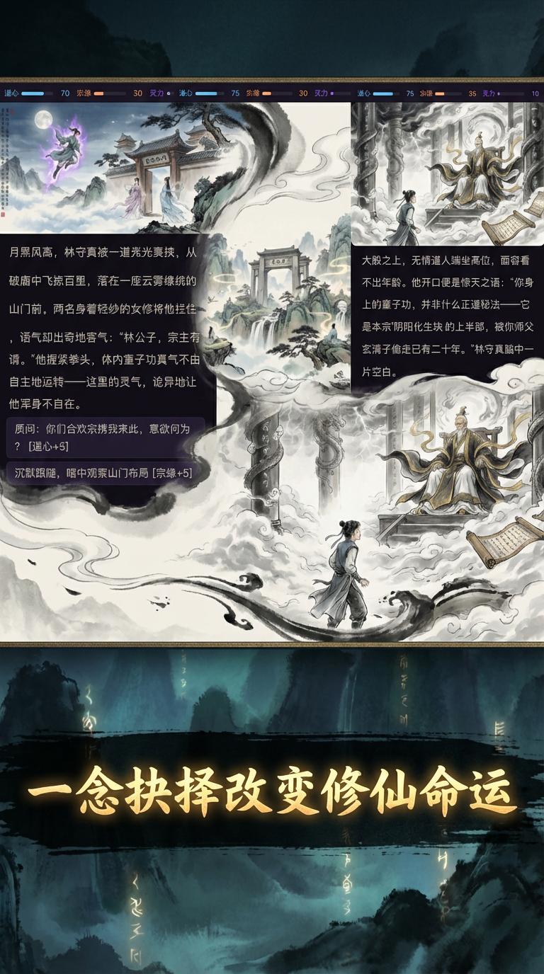 修仙文字冒险游戏,扮演误入合欢宗的少年林守真,在道心、宗缘与灵力之间抉择。每一个选择都将影响修仙之路的走向,多条支线、多种结局等你探索。一念之间,道心永固。