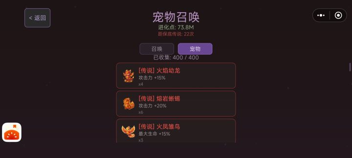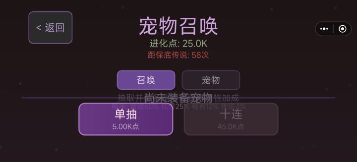 宠物全收集成就达成~生命最高50%,攻击最高40%,回血每秒5%(个人感觉最有用的一个),其他的没看,毕竟都没啥用~现在攻击力有上限了,刚玩了一局,无尽20波攻击力就到1t了,刷到82波懒得刷了(天赋主攻击力),收获120m进化点,抽宠物共计花费52m(40m就399了,最后一个花了10几m)