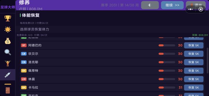 看我钱 800m 我练球员 测试成长 跳过比赛 无意间发现的 概率太夸张 就刚刚欧冠输一场 而且 伤病少球员 5 6个也能赢 😅 因为我跳过太多 导致提示 最少几个球员才能比赛 而且球员成长是不是依照最强属性条来提升可成长最强属性空间 比如一条最强属性99 就可以全部提升到99 因为我有个最强85的 卡在85 99的还能提升