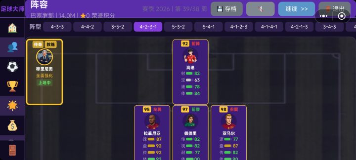 数据好像还是不太合理,传奇教练+基本90以上的阵容,一个赛季下来进球最少(第一名进84个,我方进25个),每场射门基本都是射偏