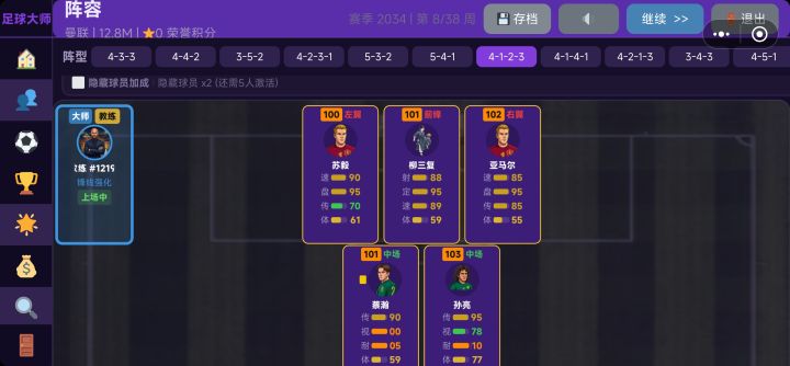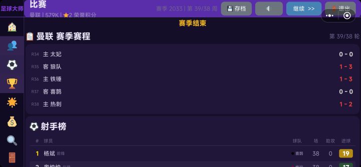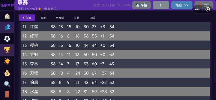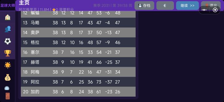 数据好像还是不太合理,传奇教练+基本90以上的阵容,一个赛季下来进球最少(第一名进84个,我方进25个),每场射门基本都是射偏