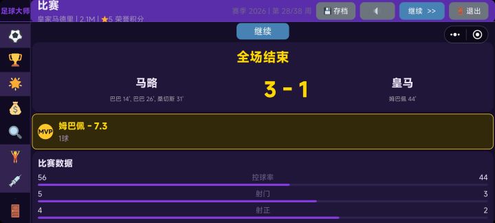 数据好像还是不太合理,传奇教练+基本90以上的阵容,一个赛季下来进球最少(第一名进84个,我方进25个),每场射门基本都是射偏