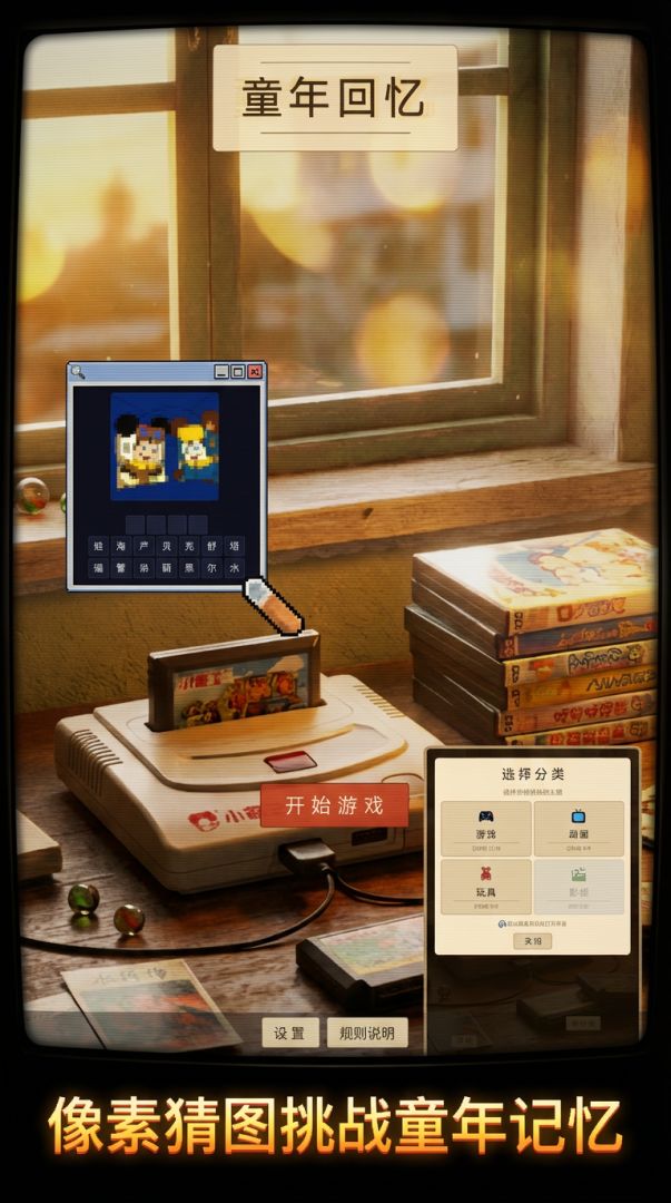 重回80、90年代的美好时光!看像素图猜经典角色,通过游戏、动画、玩具、影视四大主题挑战你的童年记忆。