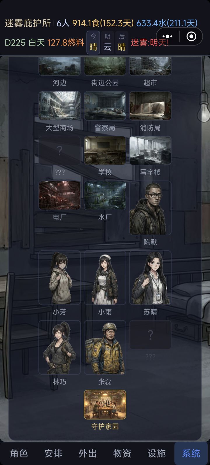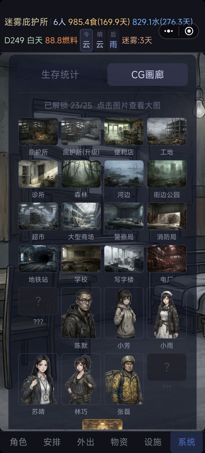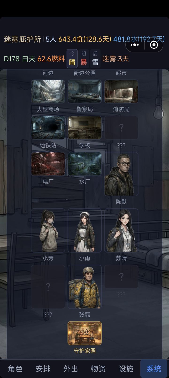 玩了230多天除了那个需要种子的差一个都建设满了,然后我看有战斗功能,迷雾开门了直接死了一个,一共就三个,战斗功能是和谁打啊