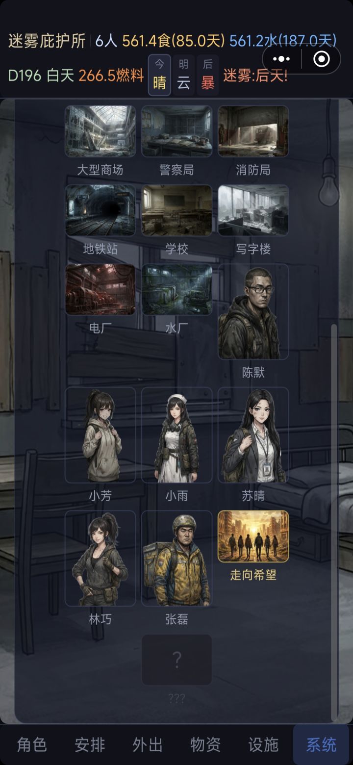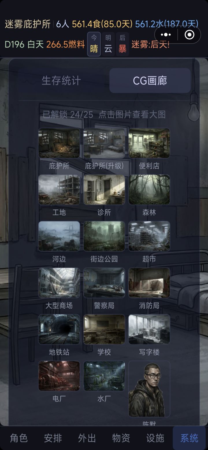 玩了5还是6周目终于把所有的CG.刷出来,说说个人感受游戏目标还是很清晰,挖掘新领域然后搜集物资然后活下去。随着庇护所人数越来越多,工作变得越来越容易,活下去的难度越来越少。这是我觉得需要改进的地方。不同的人的消耗难度应该不一致,譬如外卖小哥食物2.0,大学生0.8,我觉得可以有所优化。其次搜集物品的次数固定三次,前期有难度,后期基本一个结算周期内可以全部探索,没有挑战性。建议可以加入搜集过