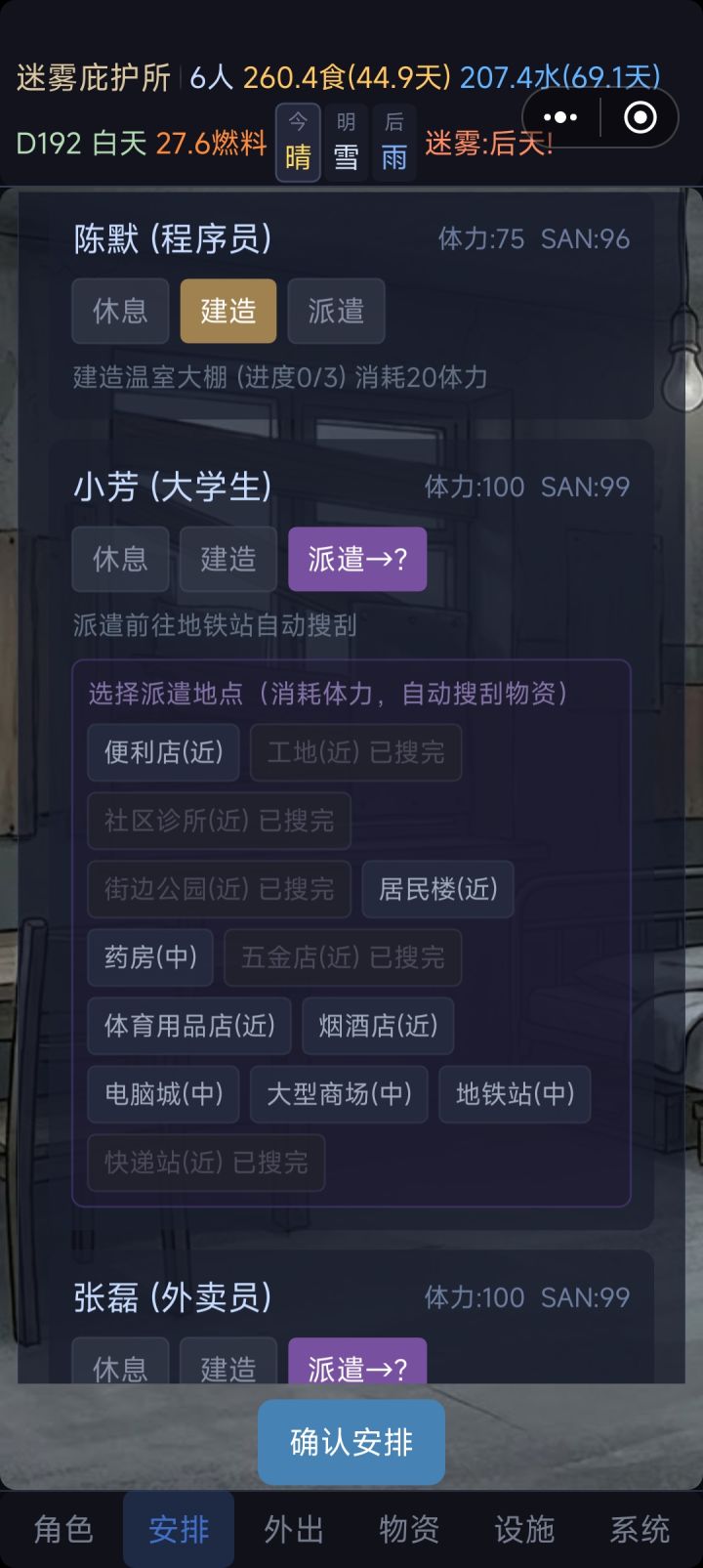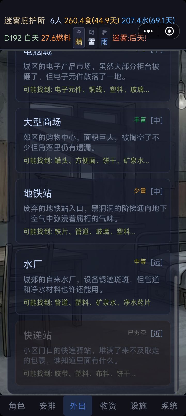 玩了5还是6周目终于把所有的CG.刷出来,说说个人感受游戏目标还是很清晰,挖掘新领域然后搜集物资然后活下去。随着庇护所人数越来越多,工作变得越来越容易,活下去的难度越来越少。这是我觉得需要改进的地方。不同的人的消耗难度应该不一致,譬如外卖小哥食物2.0,大学生0.8,我觉得可以有所优化。其次搜集物品的次数固定三次,前期有难度,后期基本一个结算周期内可以全部探索,没有挑战性。建议可以加入搜集过