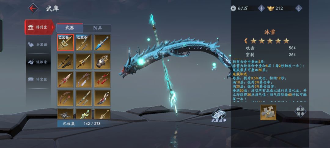 武器篇 弓箭:新岁 落日弓 泪雨 血滴子:金刚琢 剑:鲨齿/狂歌行 玄枝/阴阳鱼 伏魔/春风寒 链剑:打神鞭 绝煞 捆仙绳 苍幡 拳套:云极 乾坤圈 猛虎八极 扇子:惊鸿 清泉音 枪:寒心 建木 火尖枪 沐雪 棍:沧水/金箍棒 正气扫帚 湘妃竹/三世因果 大刀:叠嶂 龙将 匕首:鹰吻 分龙刺 唐刀:乾坤尺 雷赐 七星 鸣鸿 大锤:轮回 防具篇 衣服:明光 珍珠 护手:非攻 刑天 吸星