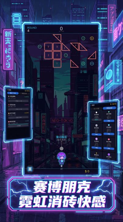 赛博朋克风弹珠消砖游戏。在霓虹闪烁的NEO-TOKYO街头,滑动瞄准发射弹珠击碎砖块,收集金币升级能力,解锁烈焰、寒冰、雷电等多种弹珠皮肤,体验爽快的弹幕消除快感!