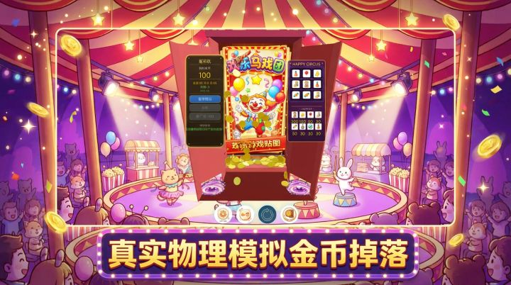 经典街机推币机完美复刻!逼真3D物理模拟,金币哗哗掉落超解压。马戏团主题精美画面,趣味转盘赢取奖励,收集硬币挑战全亮灯,重温童年游戏厅的快乐时光!