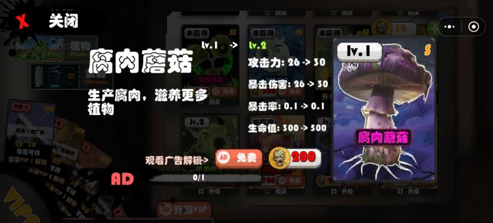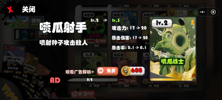 武器 / 植物格子需要看广告解锁,养成资源需求大,有点逼氪感