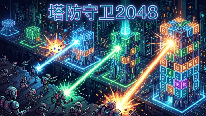 2048滑动合成与塔防守卫的创新融合,霓虹赛博风格,合并数字强化防御塔,抵御无尽怪物入侵!