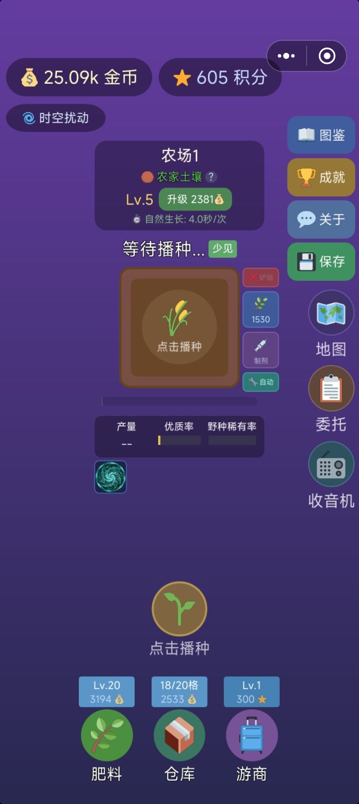 体提个建议。肥料要么金币购买。要么作物兑换两个都要感觉有点儿不舒服。农场能不能按照土地性质做一个分类。比如我有两块普通两块魔法。点击普通自动现实所有普通地块点击魔法只显示魔法地块方便管理。顺便说一句,肥料。传说和第三肥料 史诗第二种 少见没有了。直接普通合肥料这一点不太能理解。 如标题所述,应该是描述错误。