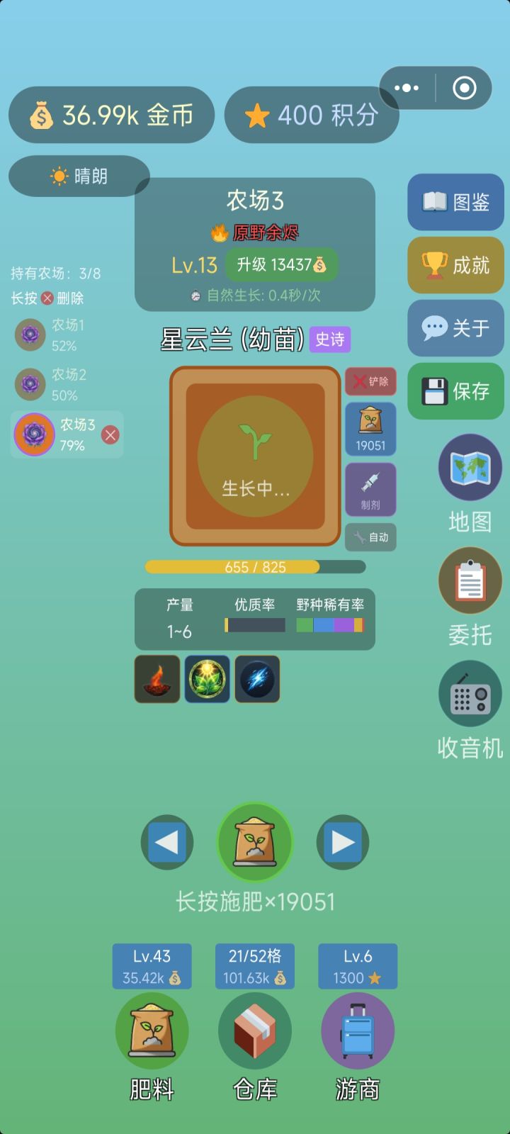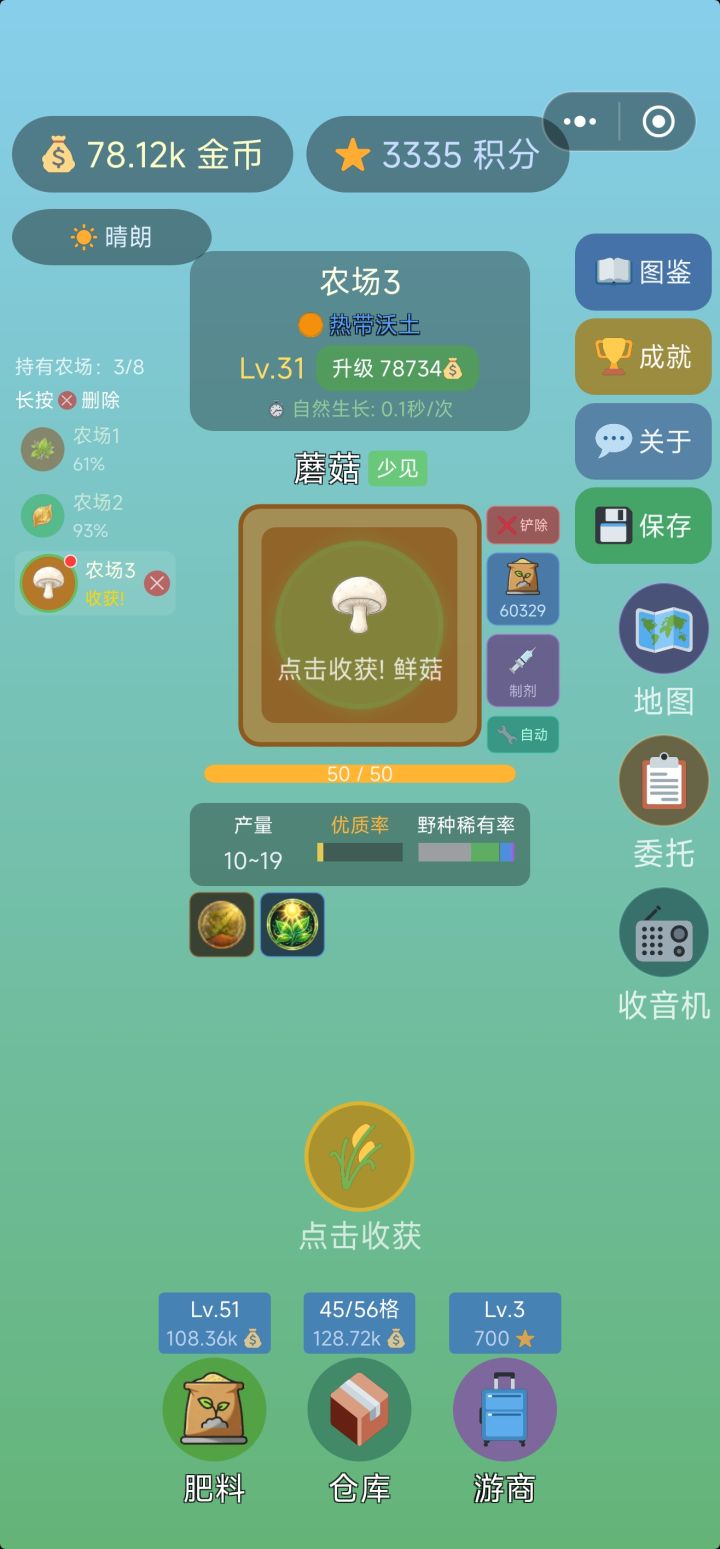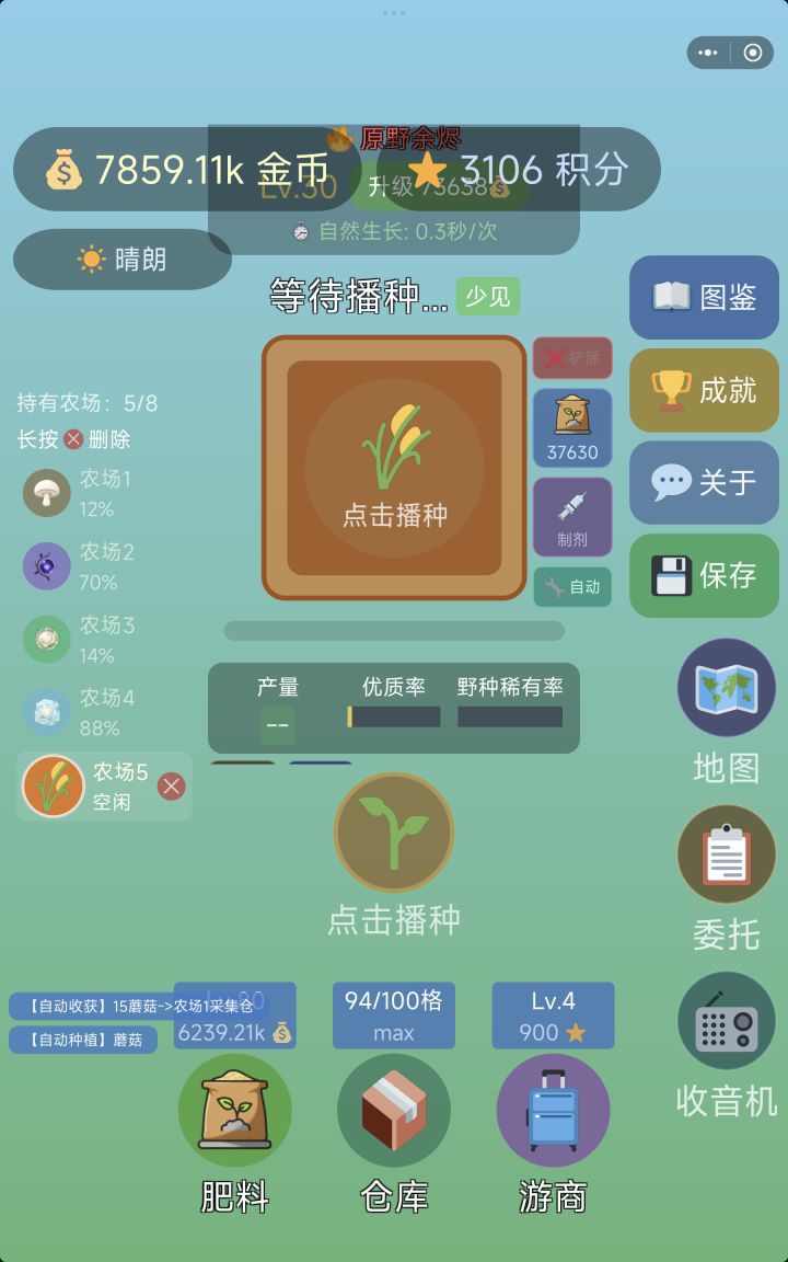 体提个建议。肥料要么金币购买。要么作物兑换两个都要感觉有点儿不舒服。农场能不能按照土地性质做一个分类。比如我有两块普通两块魔法。点击普通自动现实所有普通地块点击魔法只显示魔法地块方便管理。顺便说一句,肥料。传说和第三肥料 史诗第二种 少见没有了。直接普通合肥料这一点不太能理解。 如标题所述,应该是描述错误。