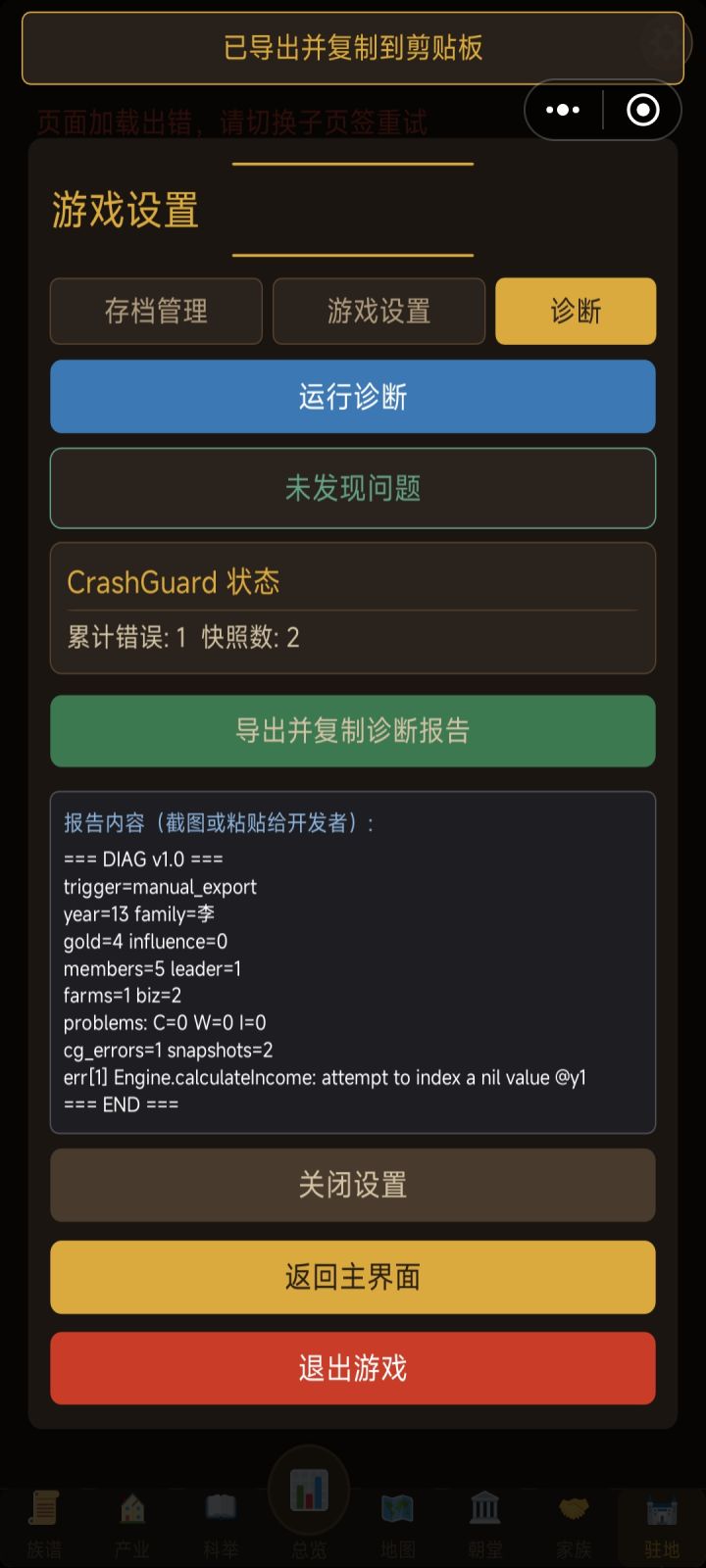 #bug反馈 目前发现的3大bug1.朝堂当官的显示每年+4影响力,实际做了几十年都没有加,导致无法升迁2.建筑修建的庭院的活动只能修建后举办一次,次年不会刷新,显示当年已举办过,无法再次举办活动3.产业天地的土地无法开荒,显示一直是0/5年,开荒进度无法增加