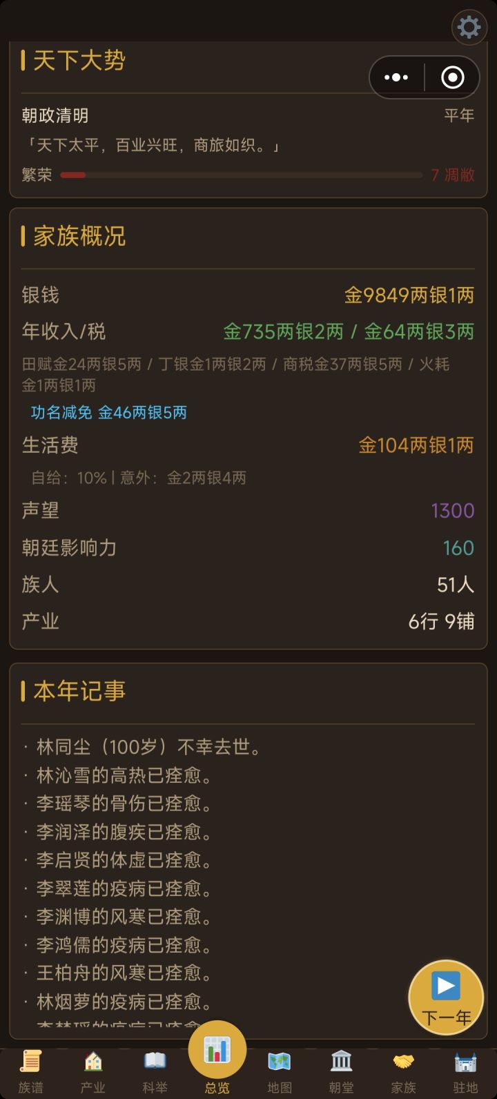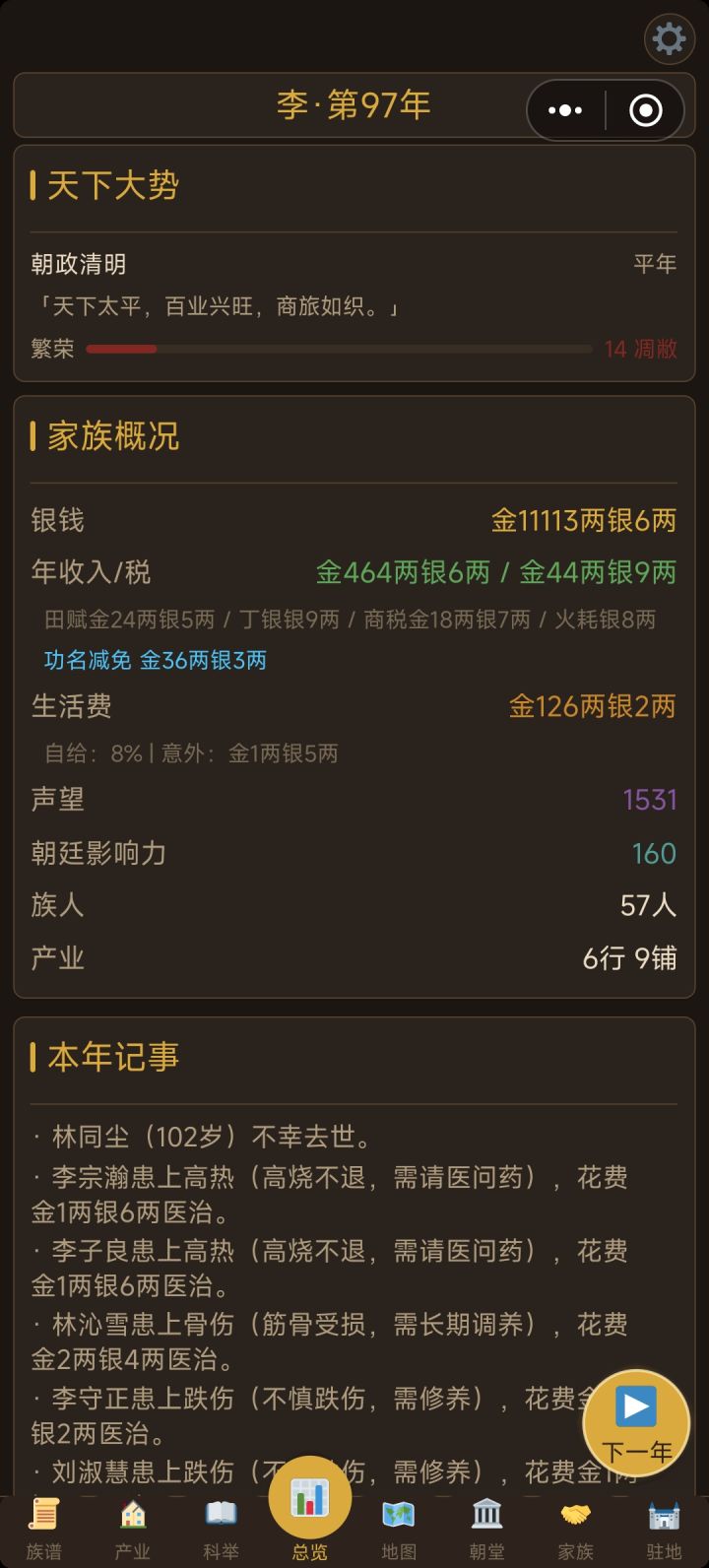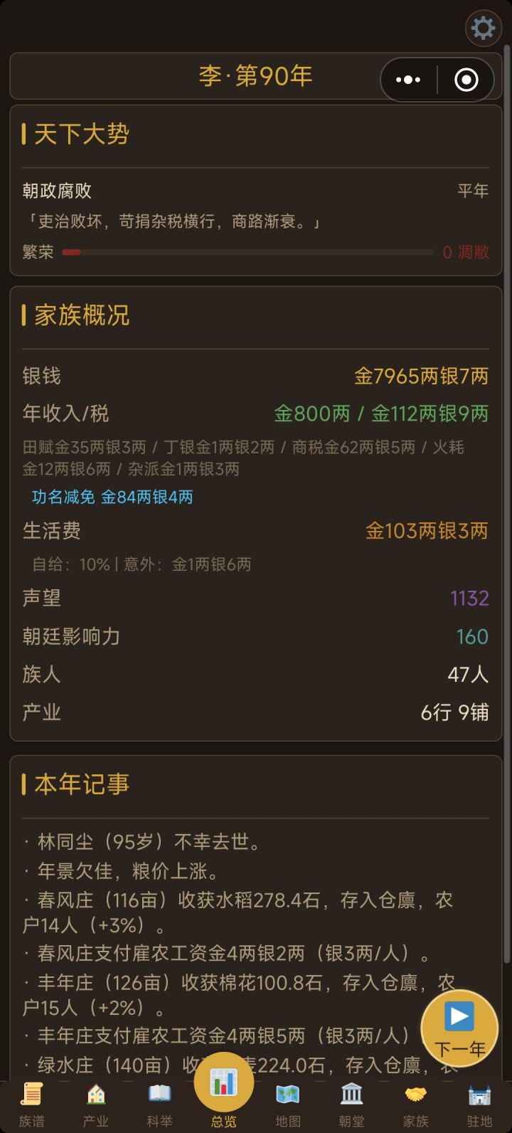 #bug反馈 目前发现的3大bug1.朝堂当官的显示每年+4影响力,实际做了几十年都没有加,导致无法升迁2.建筑修建的庭院的活动只能修建后举办一次,次年不会刷新,显示当年已举办过,无法再次举办活动3.产业天地的土地无法开荒,显示一直是0/5年,开荒进度无法增加