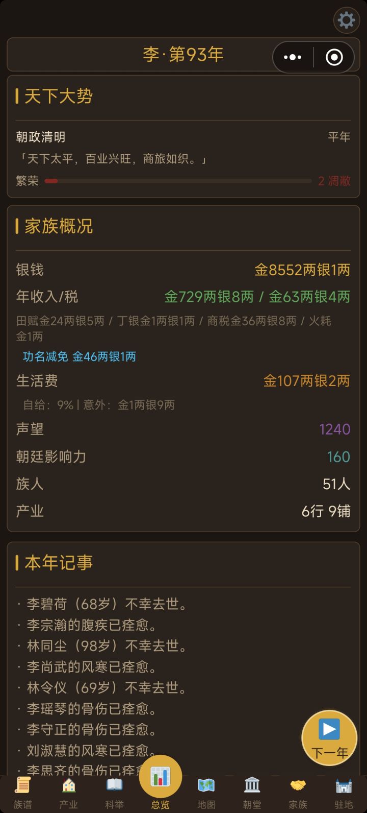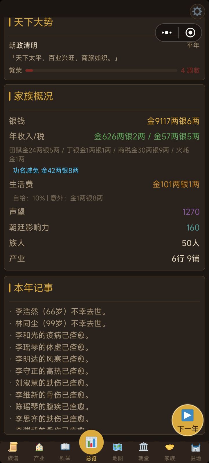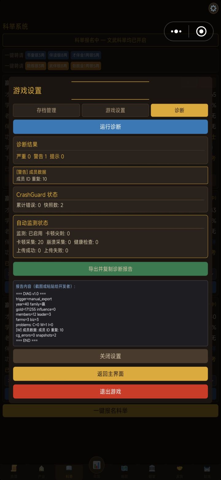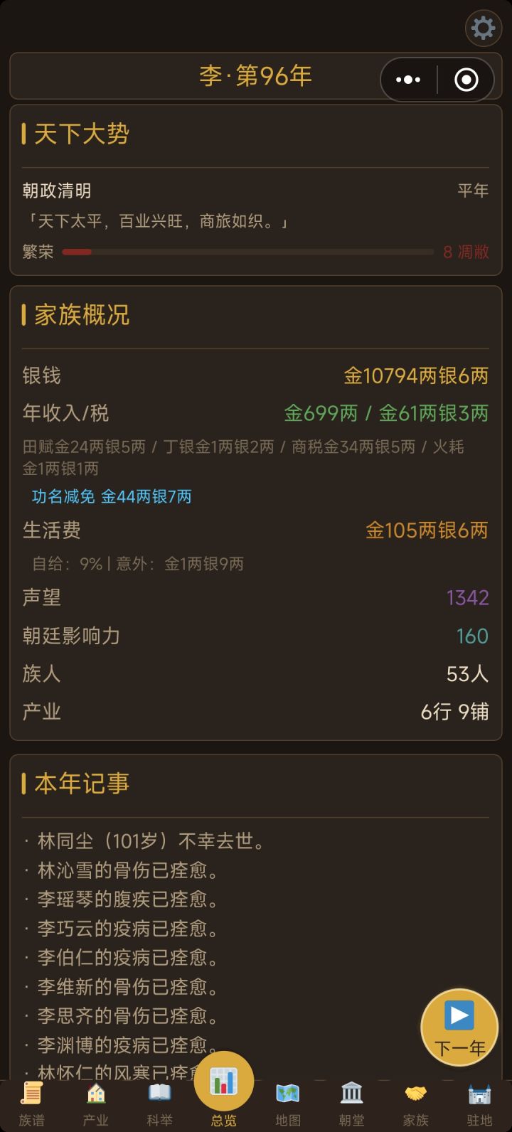 #bug反馈 目前发现的3大bug1.朝堂当官的显示每年+4影响力,实际做了几十年都没有加,导致无法升迁2.建筑修建的庭院的活动只能修建后举办一次,次年不会刷新,显示当年已举办过,无法再次举办活动3.产业天地的土地无法开荒,显示一直是0/5年,开荒进度无法增加