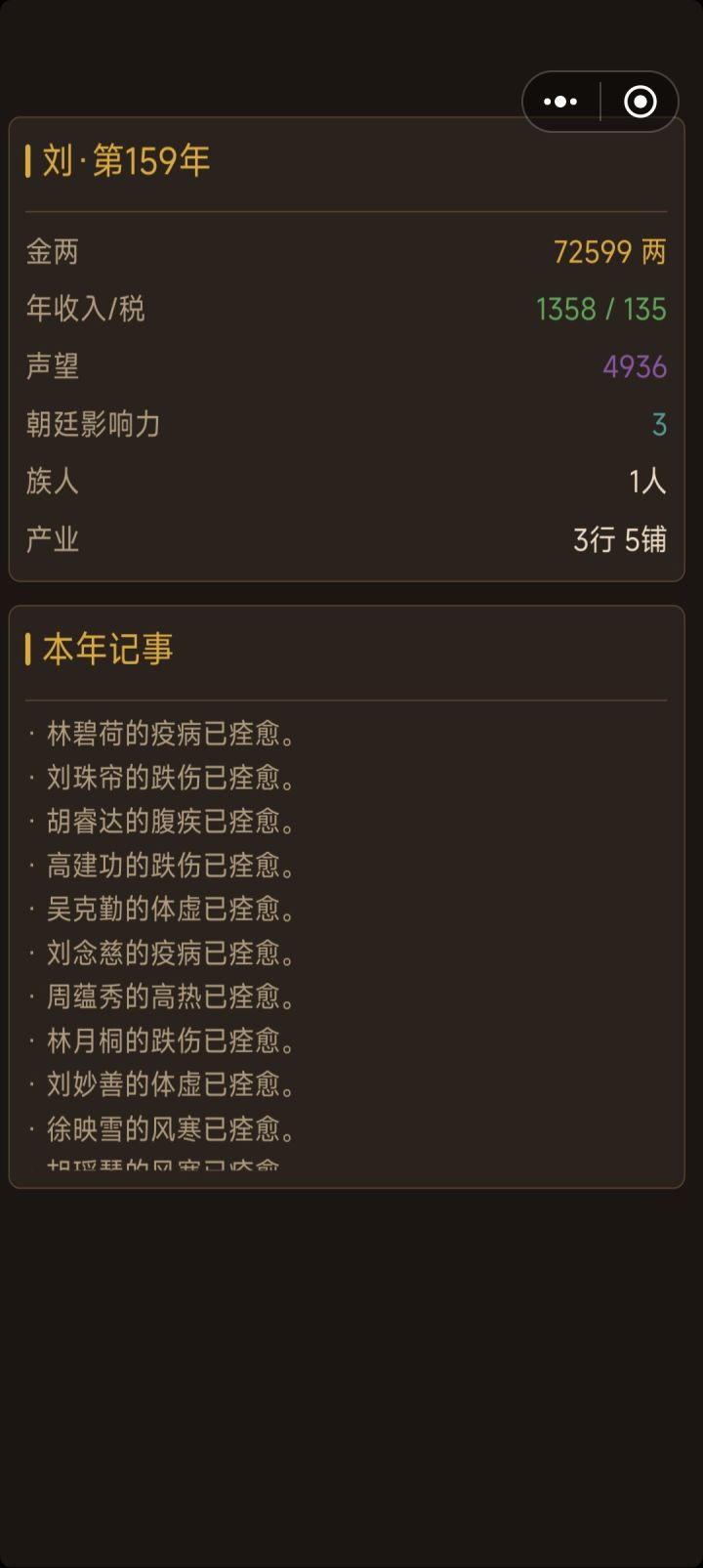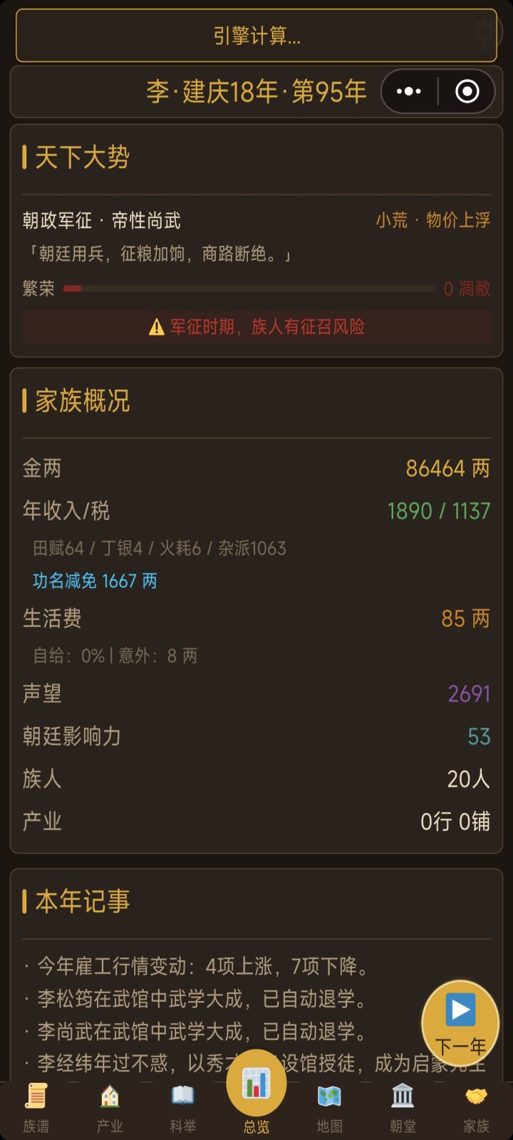 雇农的价格会有波动了,不是死板赚钱。仓禀可以存粮,等粮价高再卖。但是吧,十年以内还是无脑赚钱。阶层上升曲线还是过于陡峭,假且没有奋斗欲望,可玩性不足。碰上开局科举比较频繁,第一代人就能中进士,变化堪比范进中举。三代人就可以全员宰相。仓禀虽然能够存粮,但是容量很低,升满雇十几个人也就那么点,还可以超量存全部农业产出,多少有点形同虚设。容量可以改高一点,超过的部分按比例逐年过期比较合理。农田加上一点收
